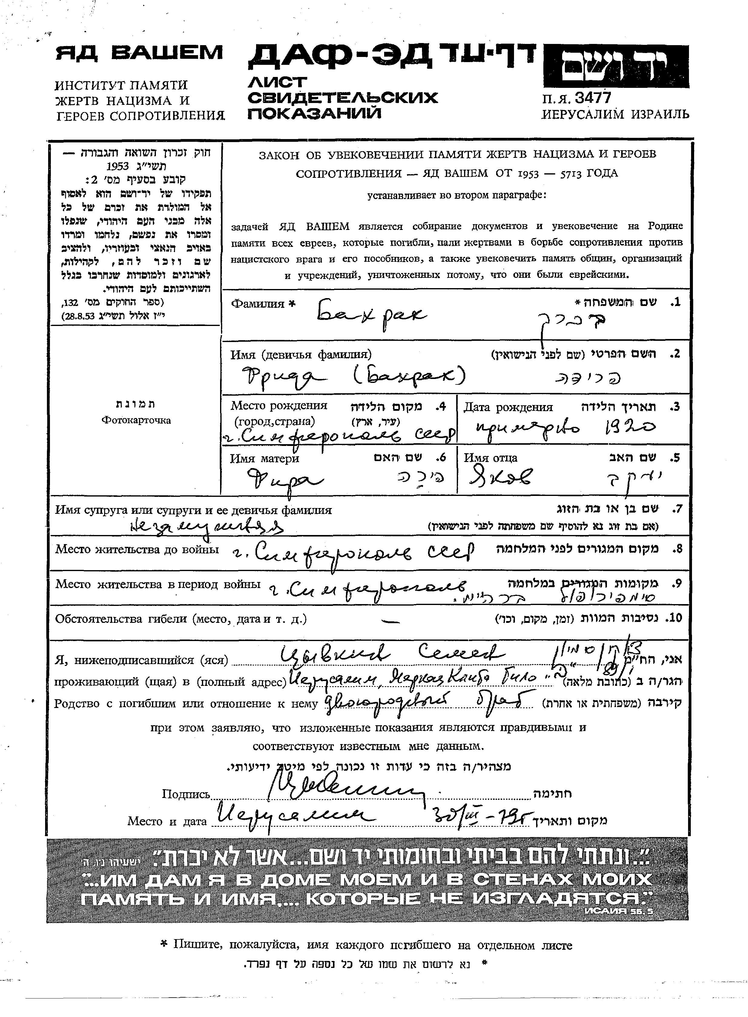 Бахрах Фрида 1920 Симферополь, Россия (СССР) Лист свидетельских показаний