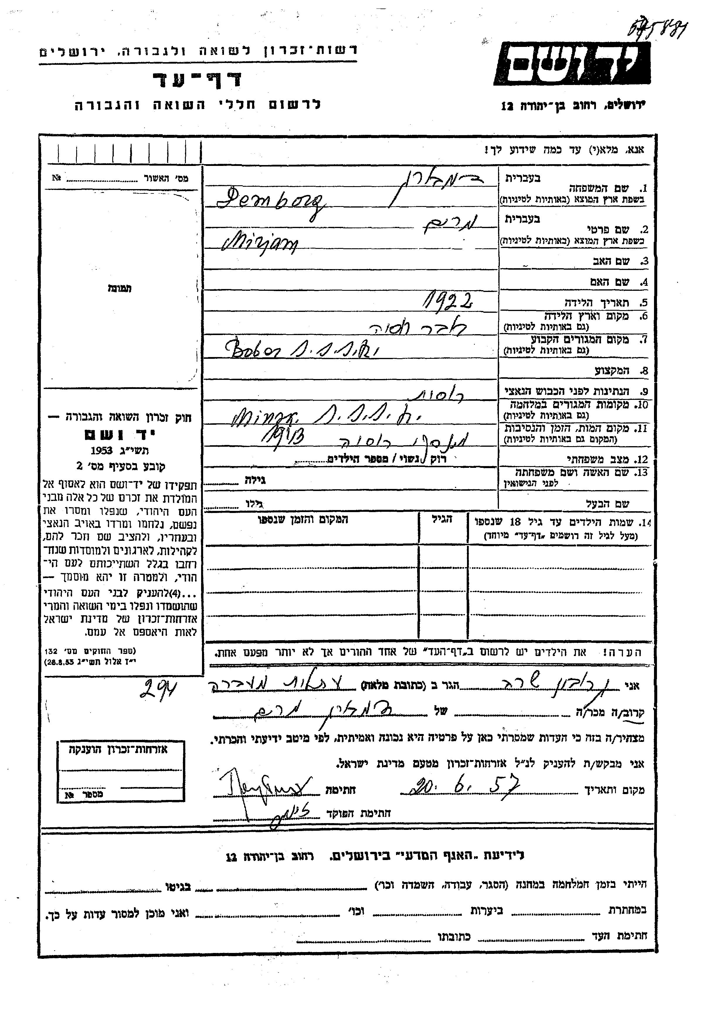 Демборг Мирьям 1922 Бобёр, Белоруссия (СССР) Лист свидетельских показаний