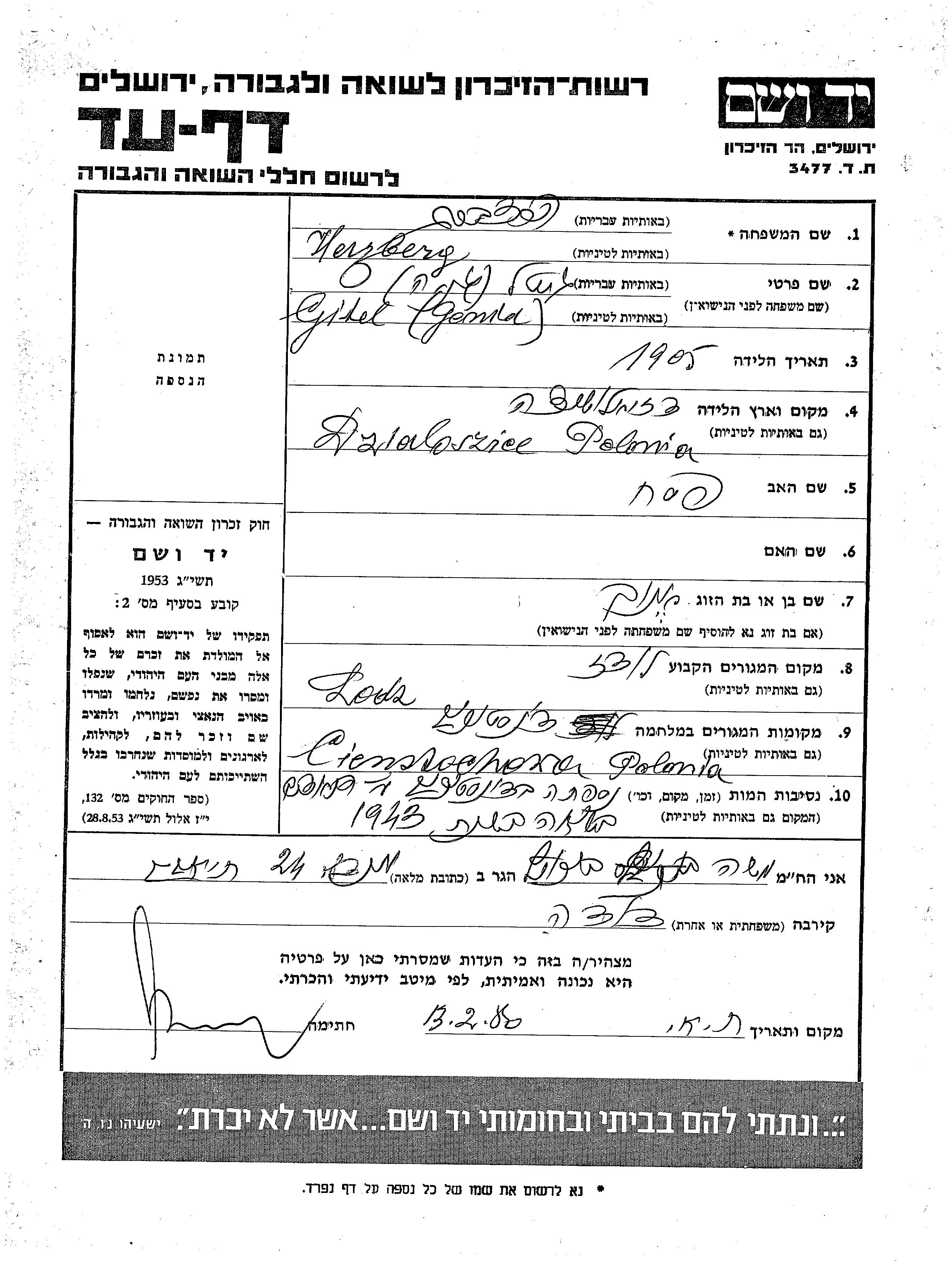 Геня Гитель Херцберг, место рождения: Дзялошице, Польша. Отец: Песах. Женат / замужем. Место жительства до войны: Лодзь, Польша. Место во время войны: Ченстхов, Польша.