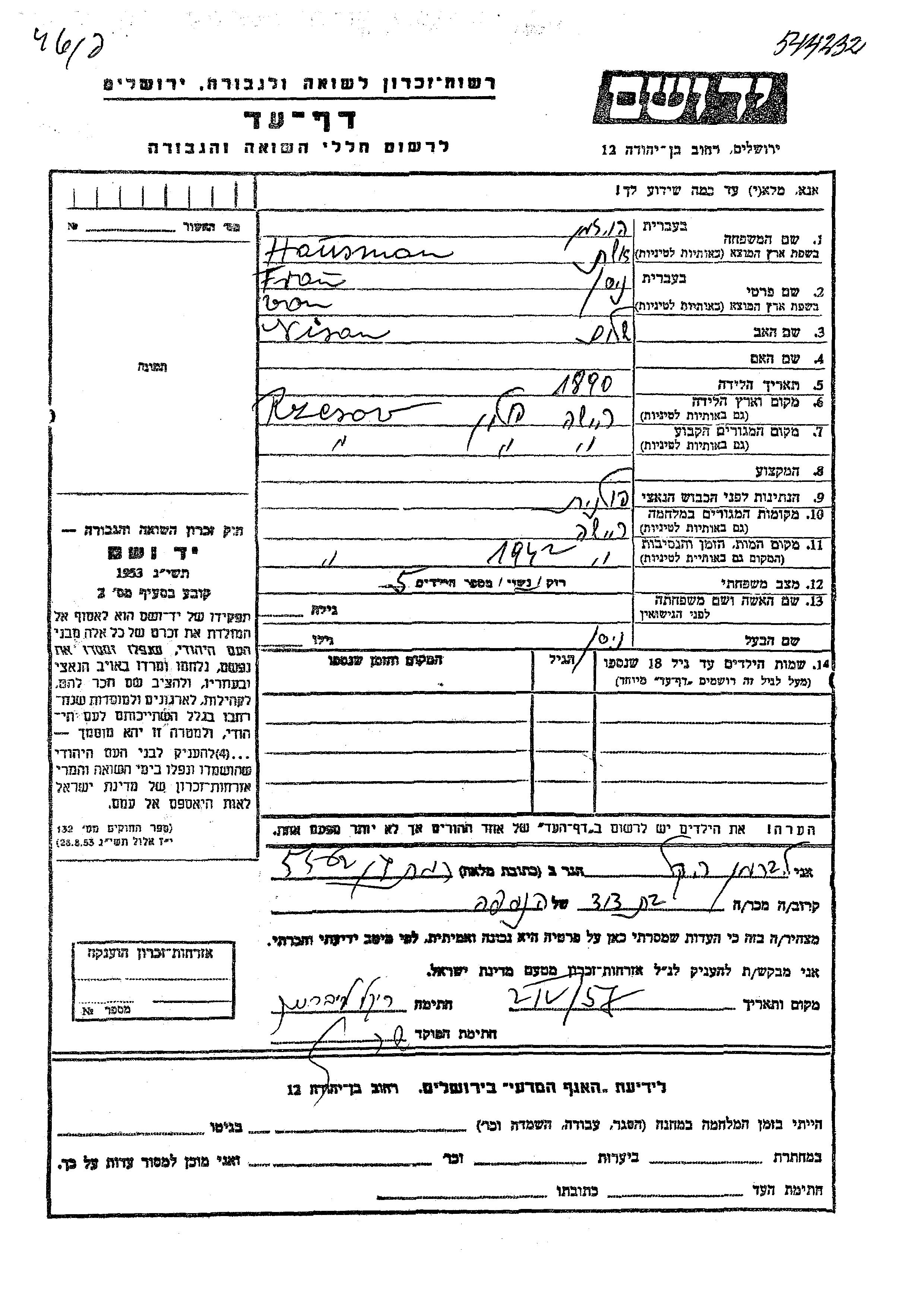Имя неизвестно Хаусман Хозман, место рождения: Жешув, Польша. Отец: Нисан Шалом. Женат / замужем. Место жительства до войны: Жешув, Польша. Место во время войны: Жешув, Польша.