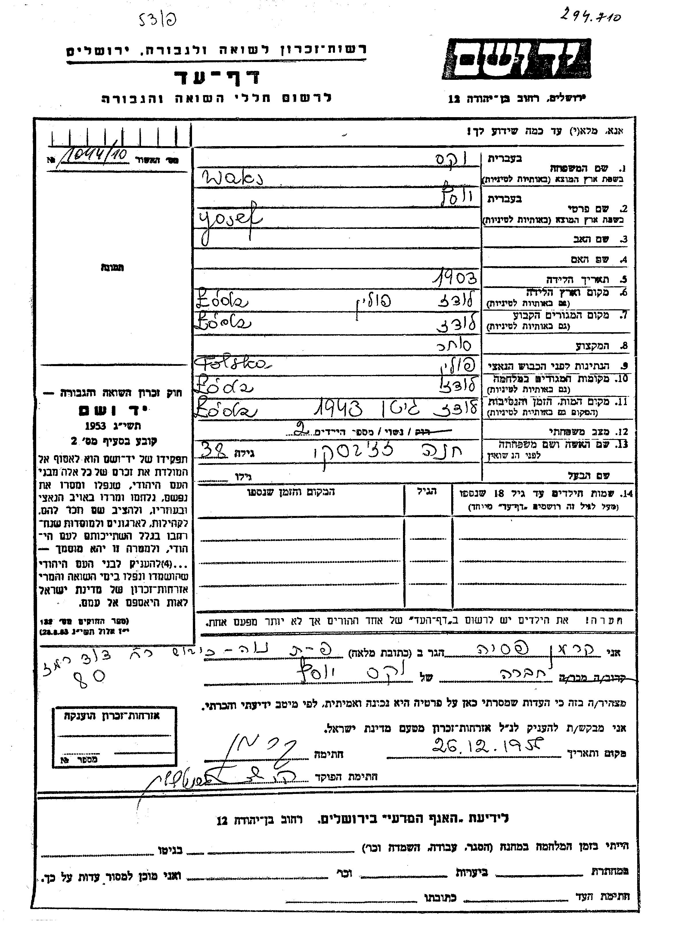 Вакс Иосеф 1903 Лодзь, Польша Лист свидетельских показаний