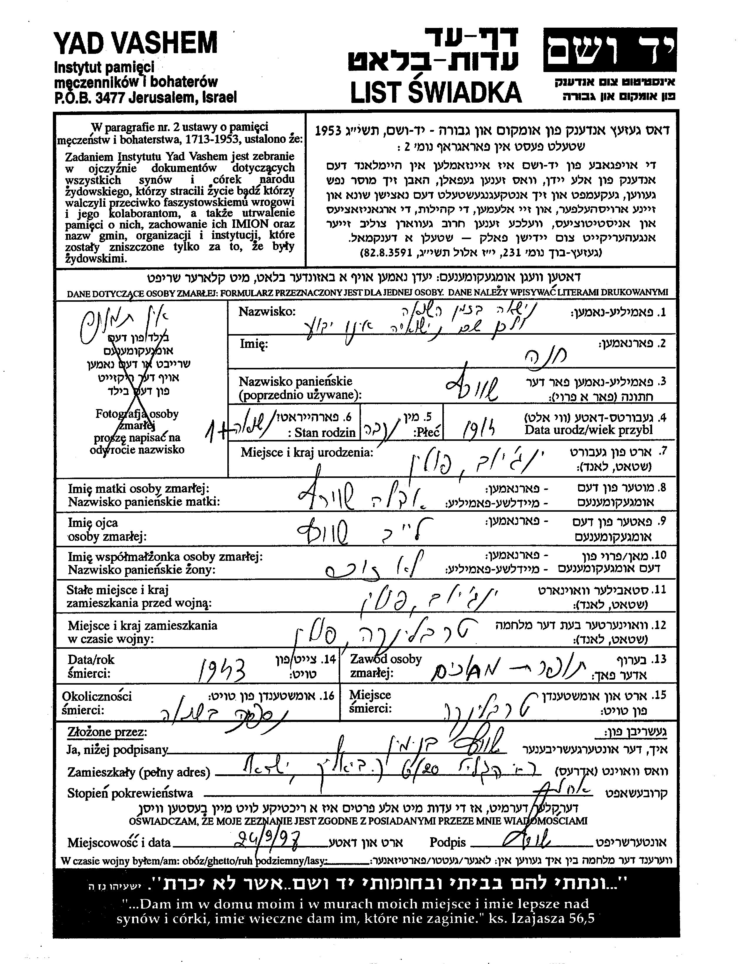 Яд Вашем - Листы свидетельских показаний Мемориального фонда