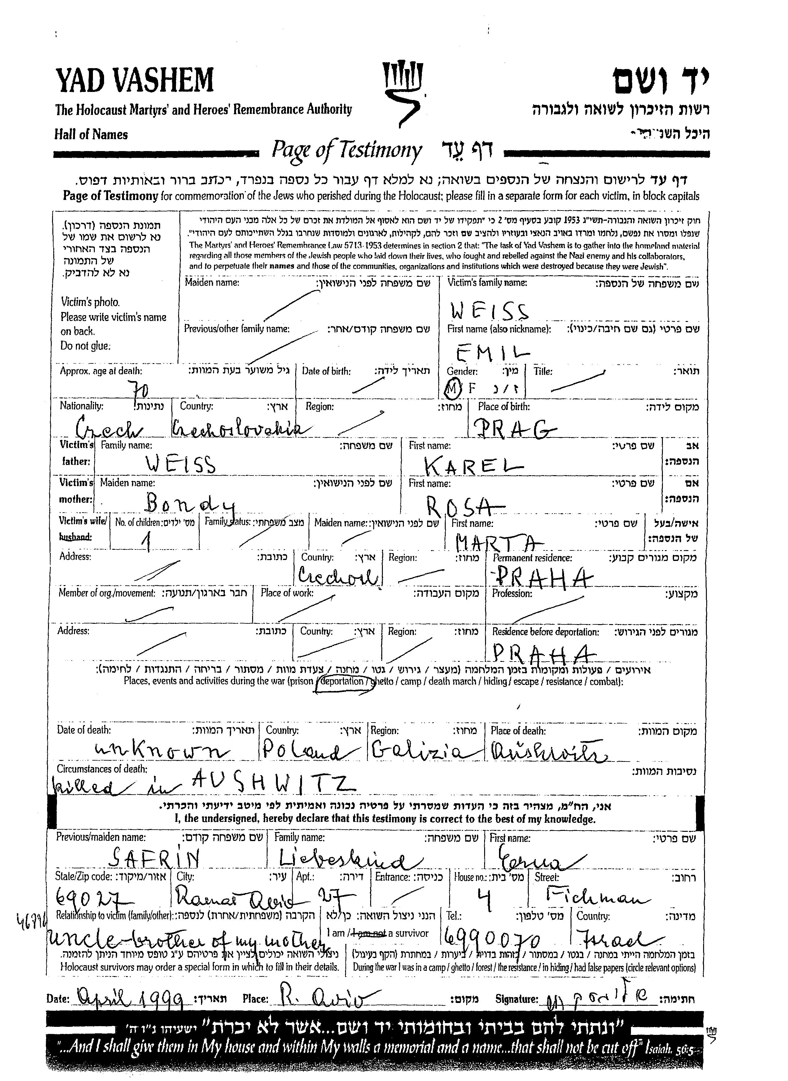Эмиль Вайсс, место рождения: Прага, Чехословакия. Место жительства до войны: Прага, Чехословакия.