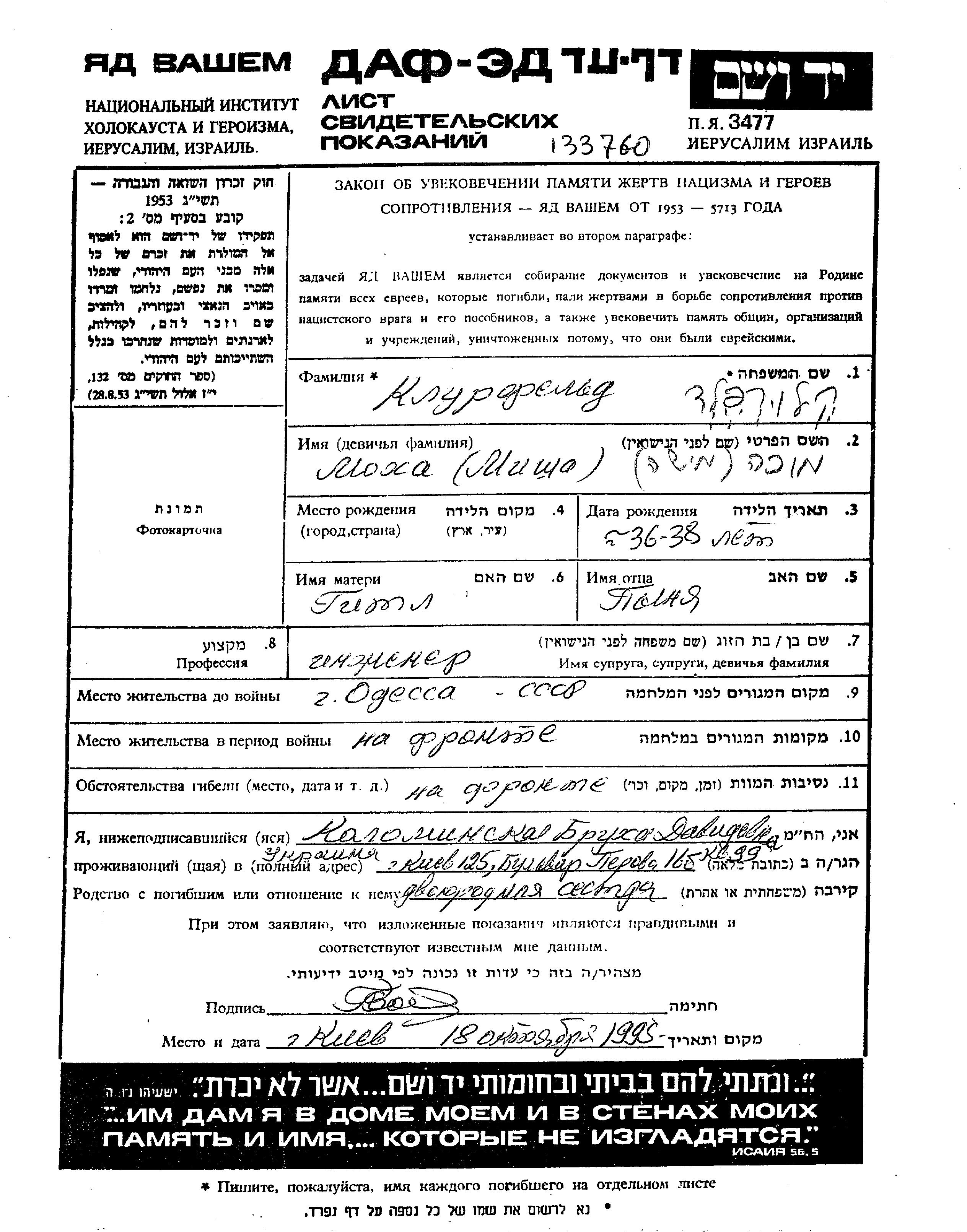 Моха Клурфельд Пыня Гитл девичья фамилия Коломинская. Инженер. Место жительства до войны: Одесса, Украина (СССР). Место во время войны: Вооруженные силы Советского Союза. Моха погиб на военной службе.