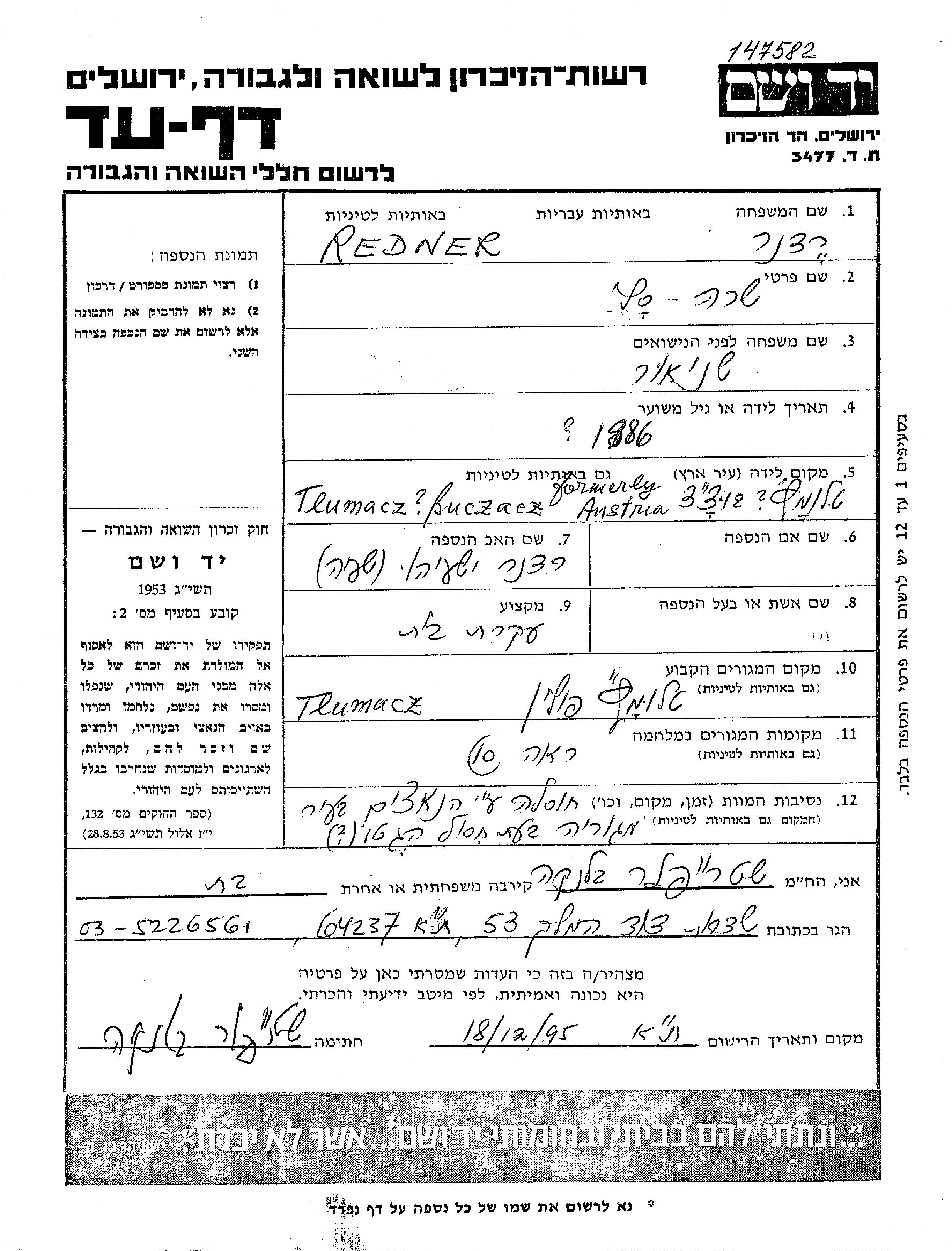 Реднер | Сали Сара | 1886 | Тлумач, Польша | Лист свидетельских показаний |