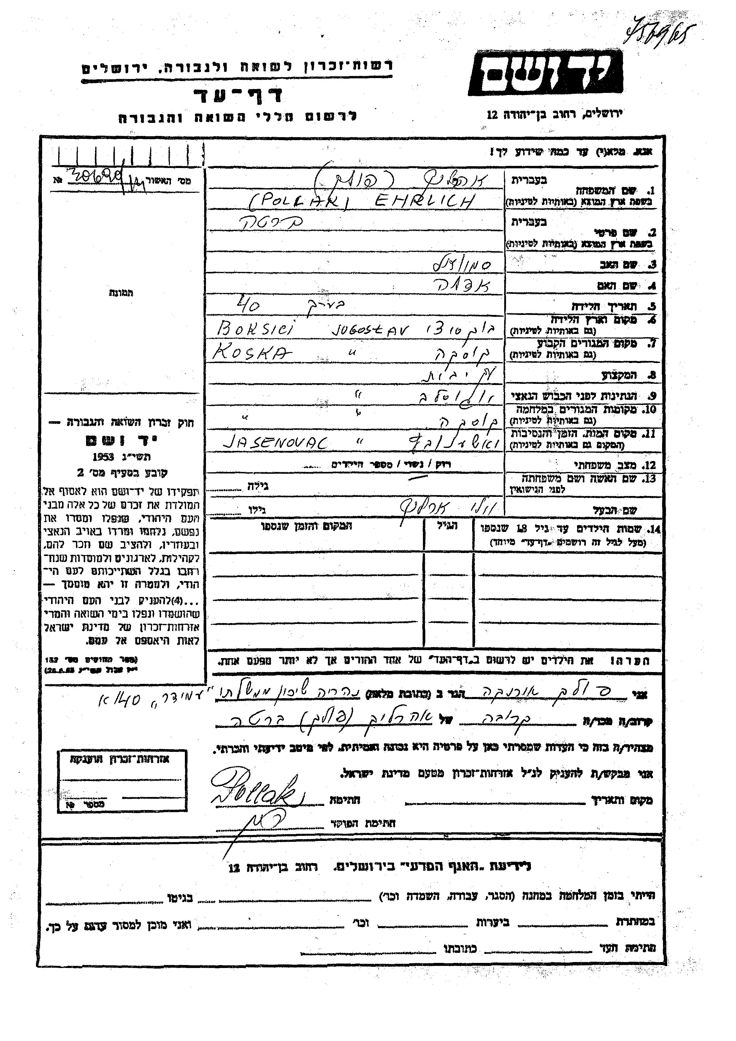 Берта Эрлих Поляк, девичья фамилия Поллак, место рождения: Бокшичи, Югославия. Торговец / торговка. Место жительства до войны: Кошка, Югославия.