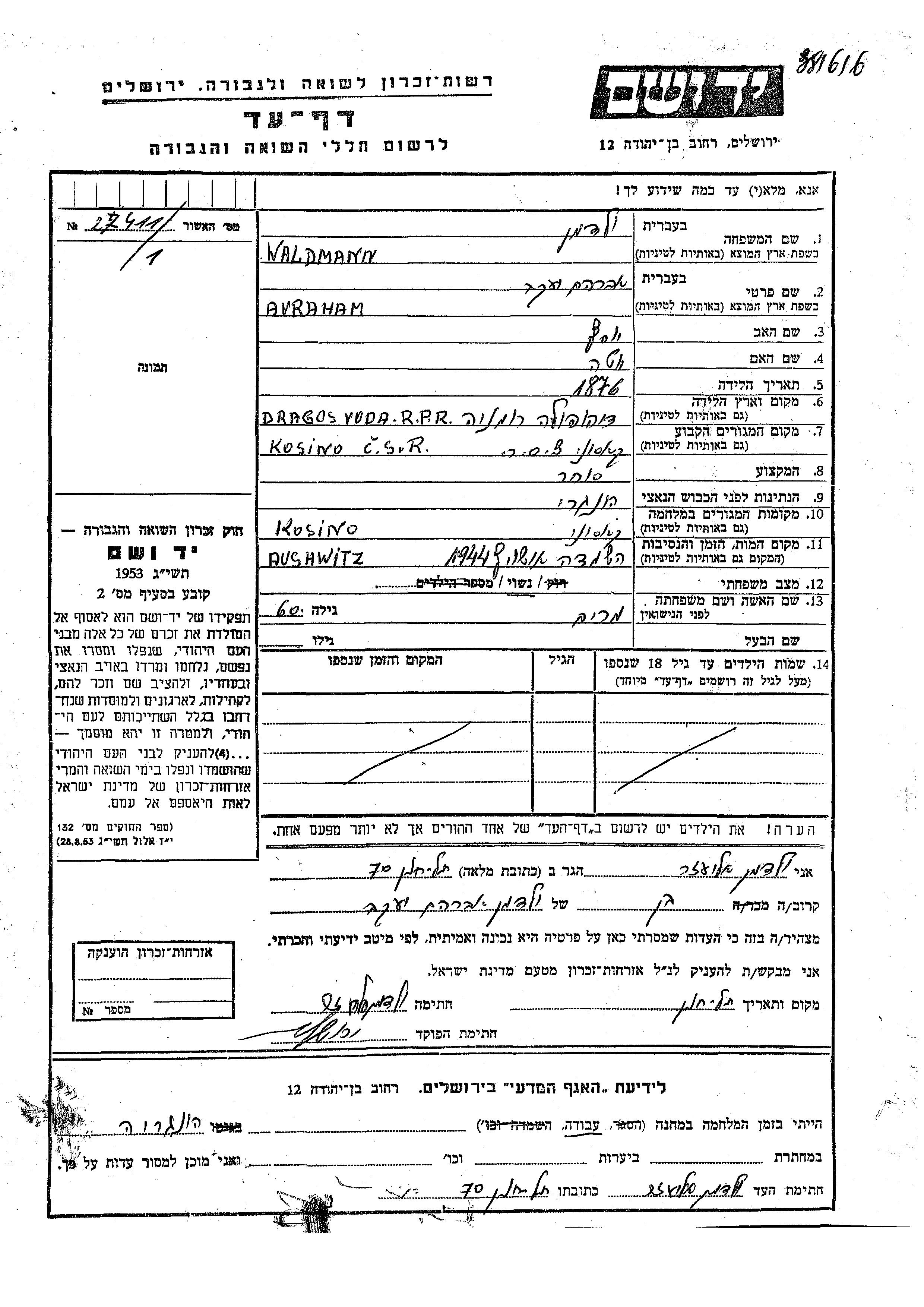 Авраам Яков Вальдманн, место рождения: Драгош Вода, Румыния. Отец: Иосеф, mать:Юта. Торговец / торговка. Женат / замужем. Место жительства до войны: Косино, Чехословакия. Место во время войны: Косино, Чехословакия.