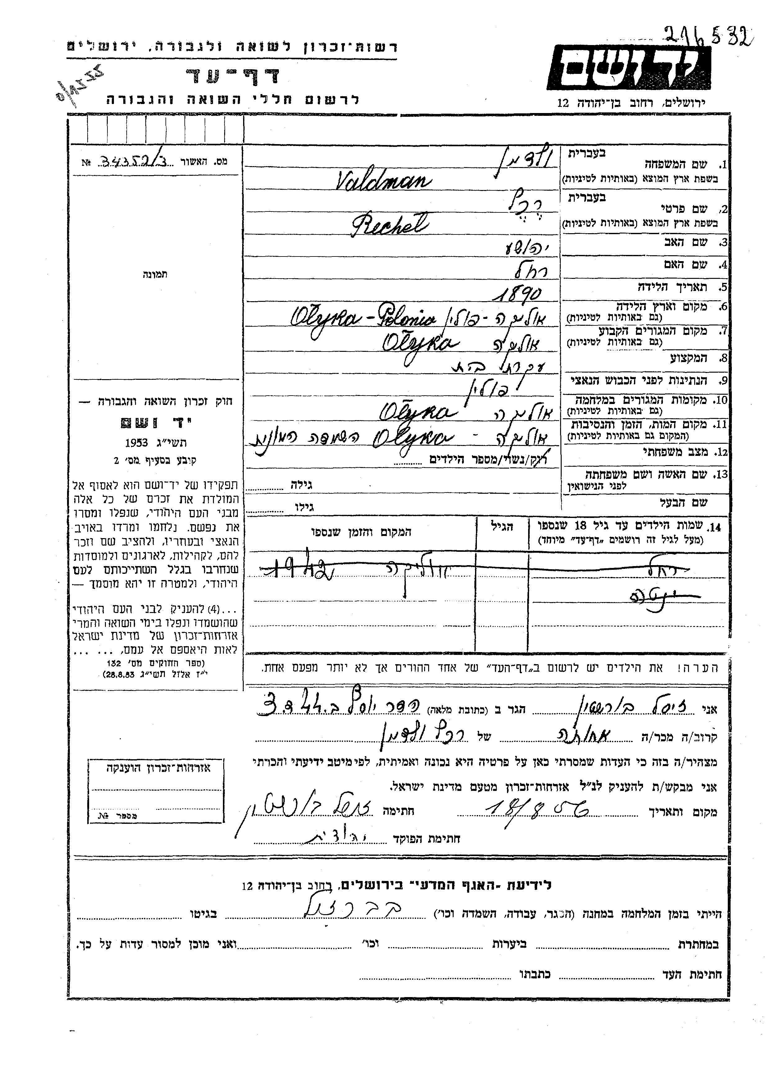 Рахель Вальдман, место рождения: Олыка, Польша. Отец: Иегошуа, mать:Рахель. Домохозяйка. Женат / замужем. Место жительства до войны: Олыка, Польша. Место во время войны: Олыка, Польша.