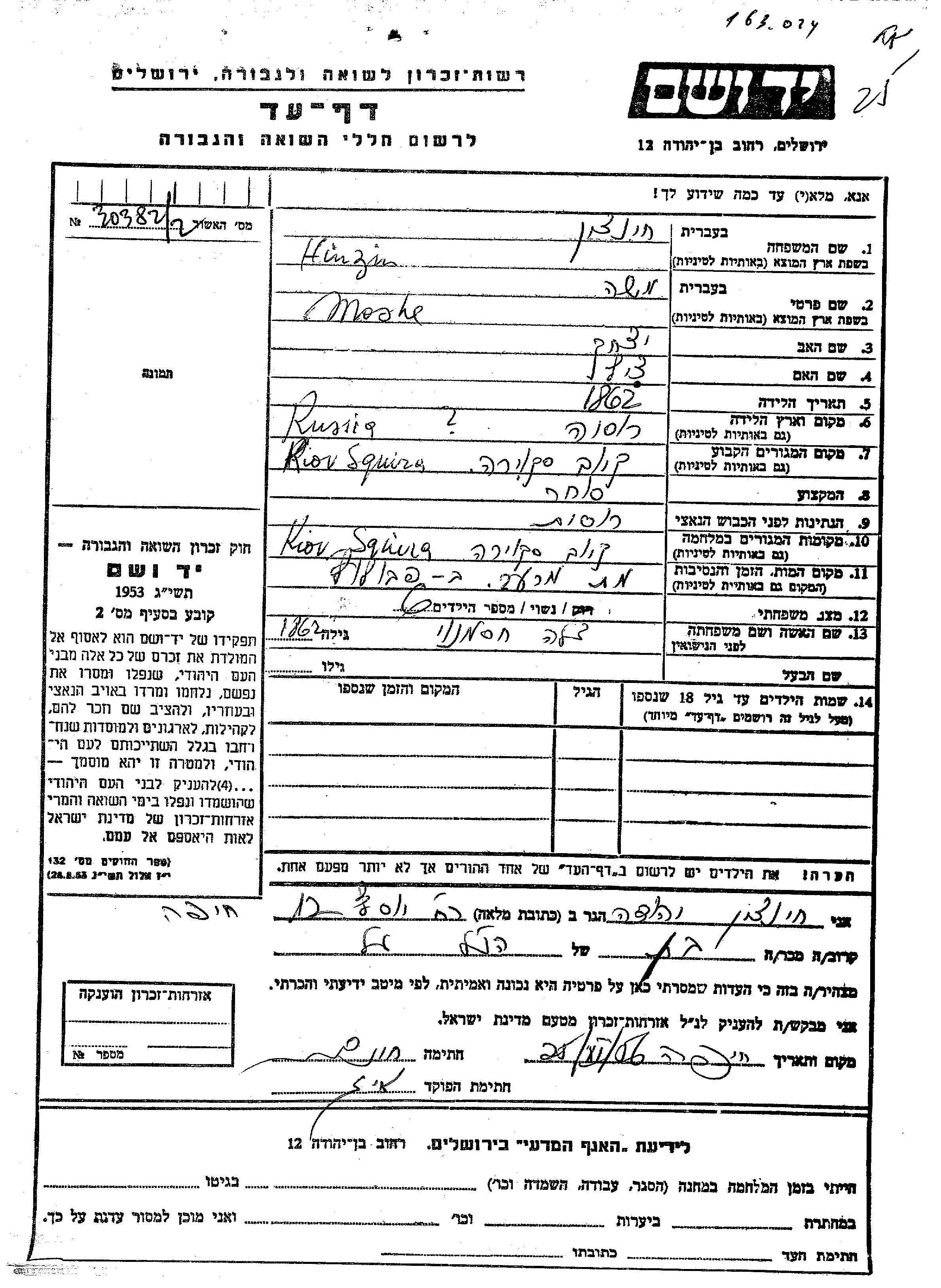 Моше Хинцин, место рождения: Россия (СССР). Отец: Ицхак, mать:Циль. Торговец / торговка. Женат / замужем. Место жительства до войны: Киев, Украина (СССР). Место во время войны: Киев, Украина (СССР).