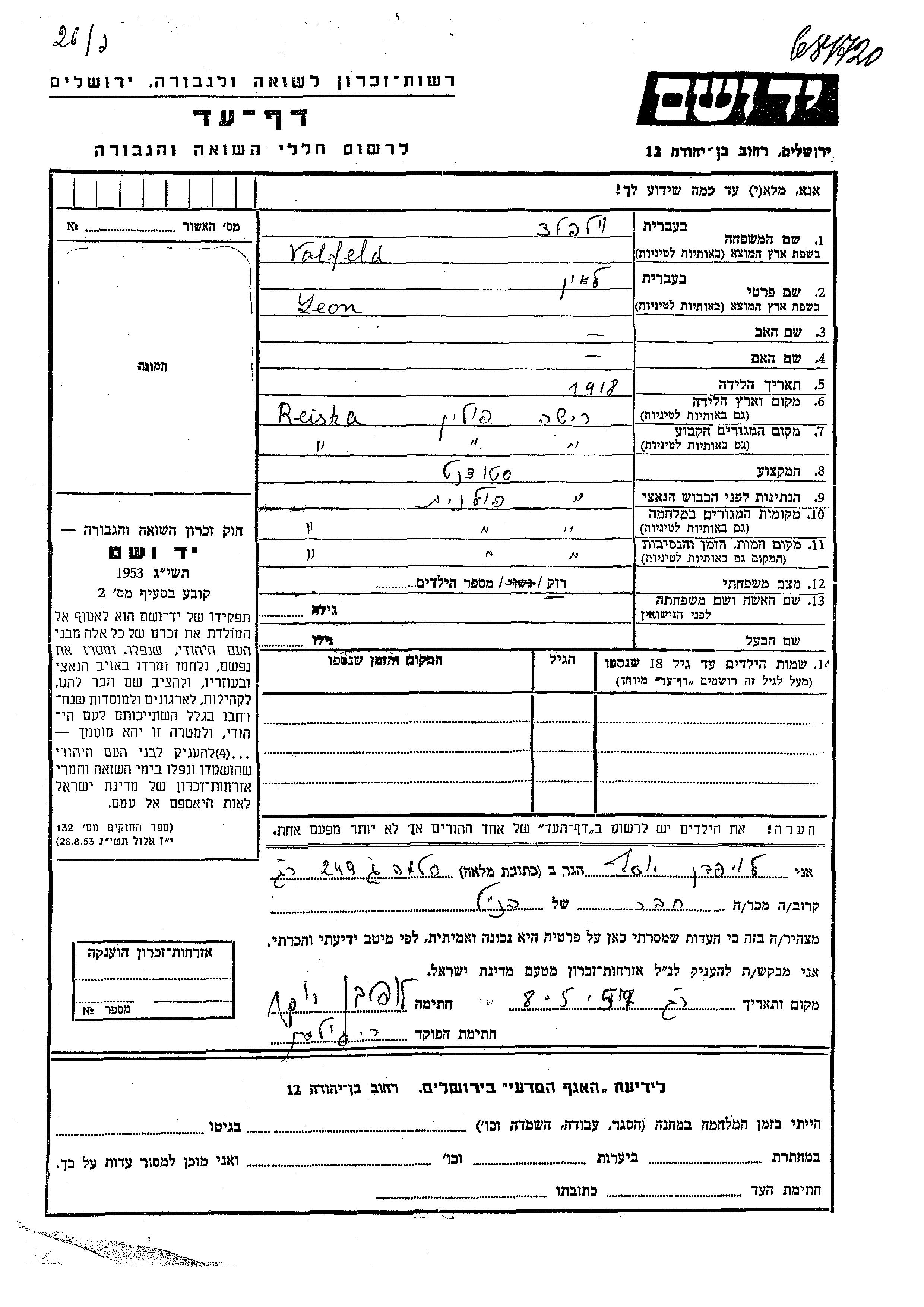 Леон Вольфельд, место рождения: Рейша, Польша. Студент / студентка. Холост / не замужем. Место жительства до войны: Рейша, Польша. Место во время войны: Рейша, Польша.