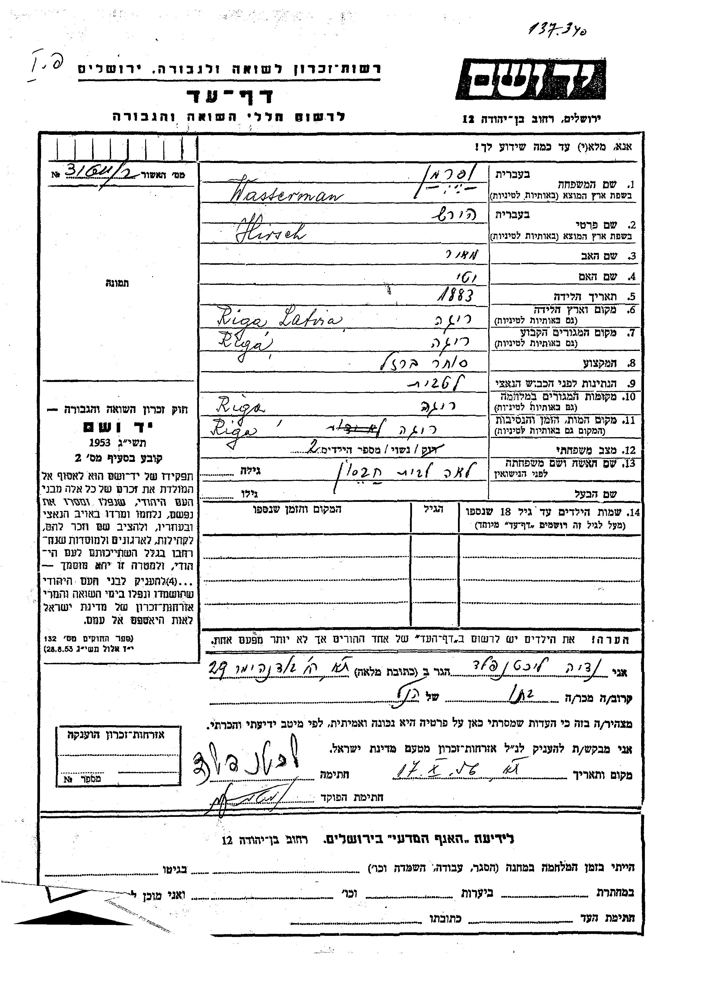 Гирш Вассерман, место рождения: Рига, Латвия. Отец: Меир, mать:Вети. Металлоторговец. Женат / замужем. Место жительства до войны: Рига, Латвия. Место во время войны: Рига, Латвия.
