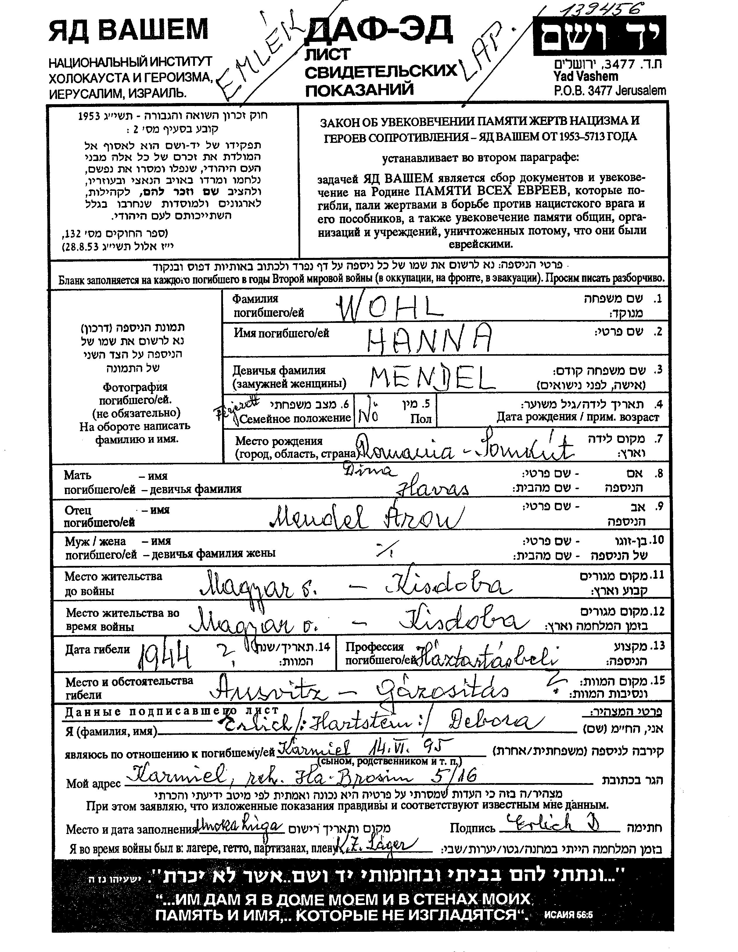 Яд Вашем - Листы свидетельских показаний Мемориального фонда