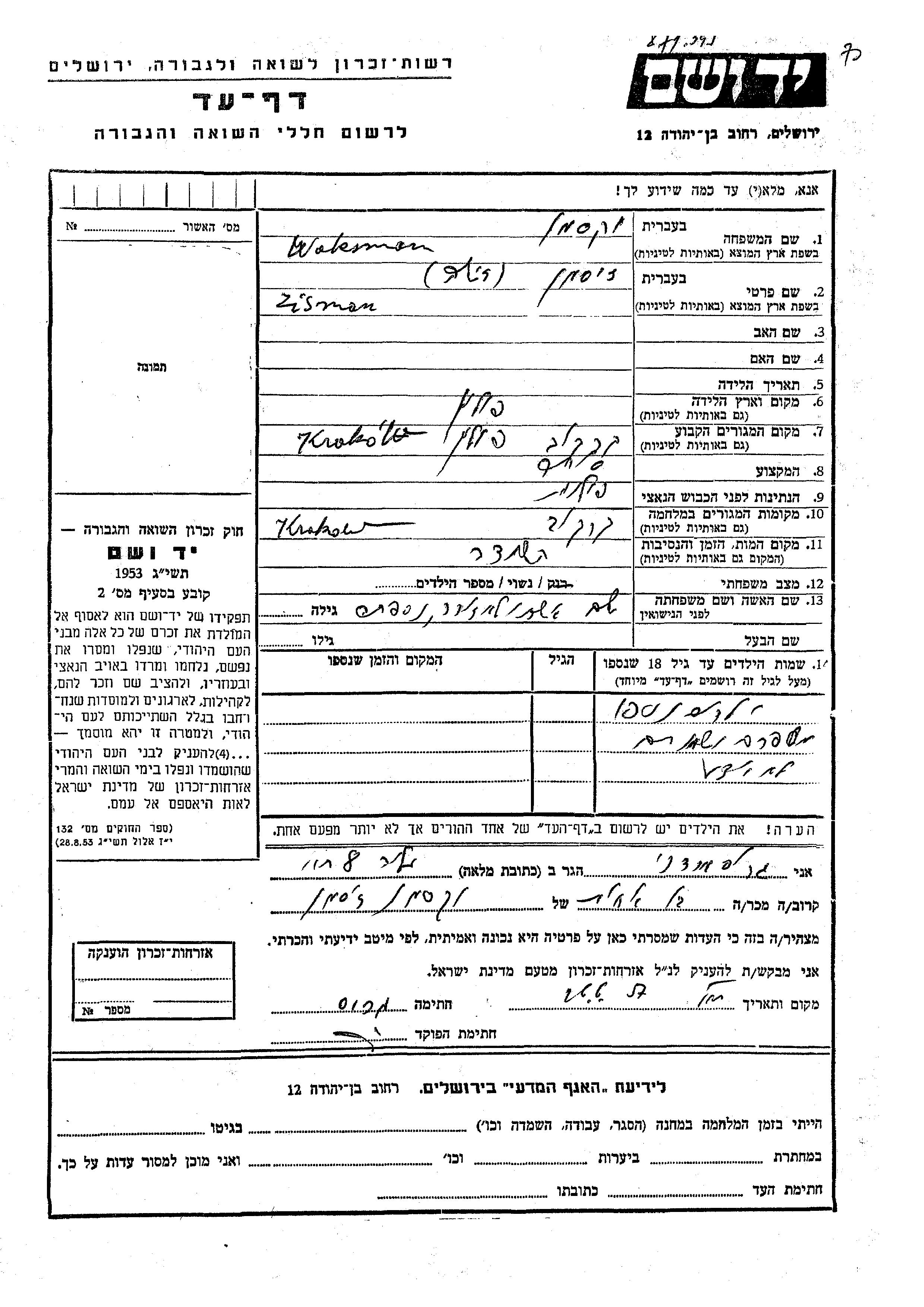 Ваксман Зисман Краков, Польша Лист свидетельских показаний