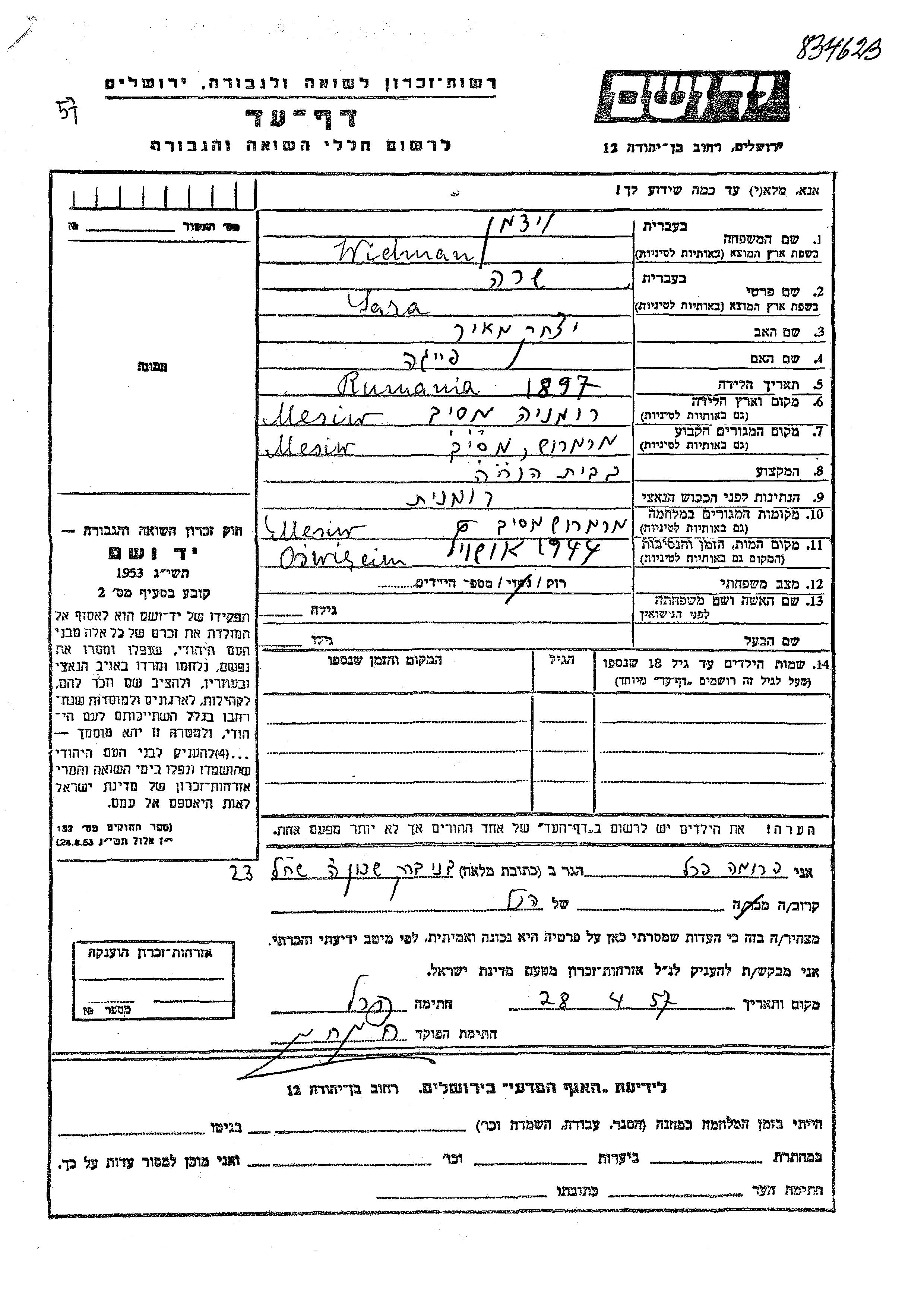 Видман Сара 1897 Месив, Румыния Лист свидетельских показаний