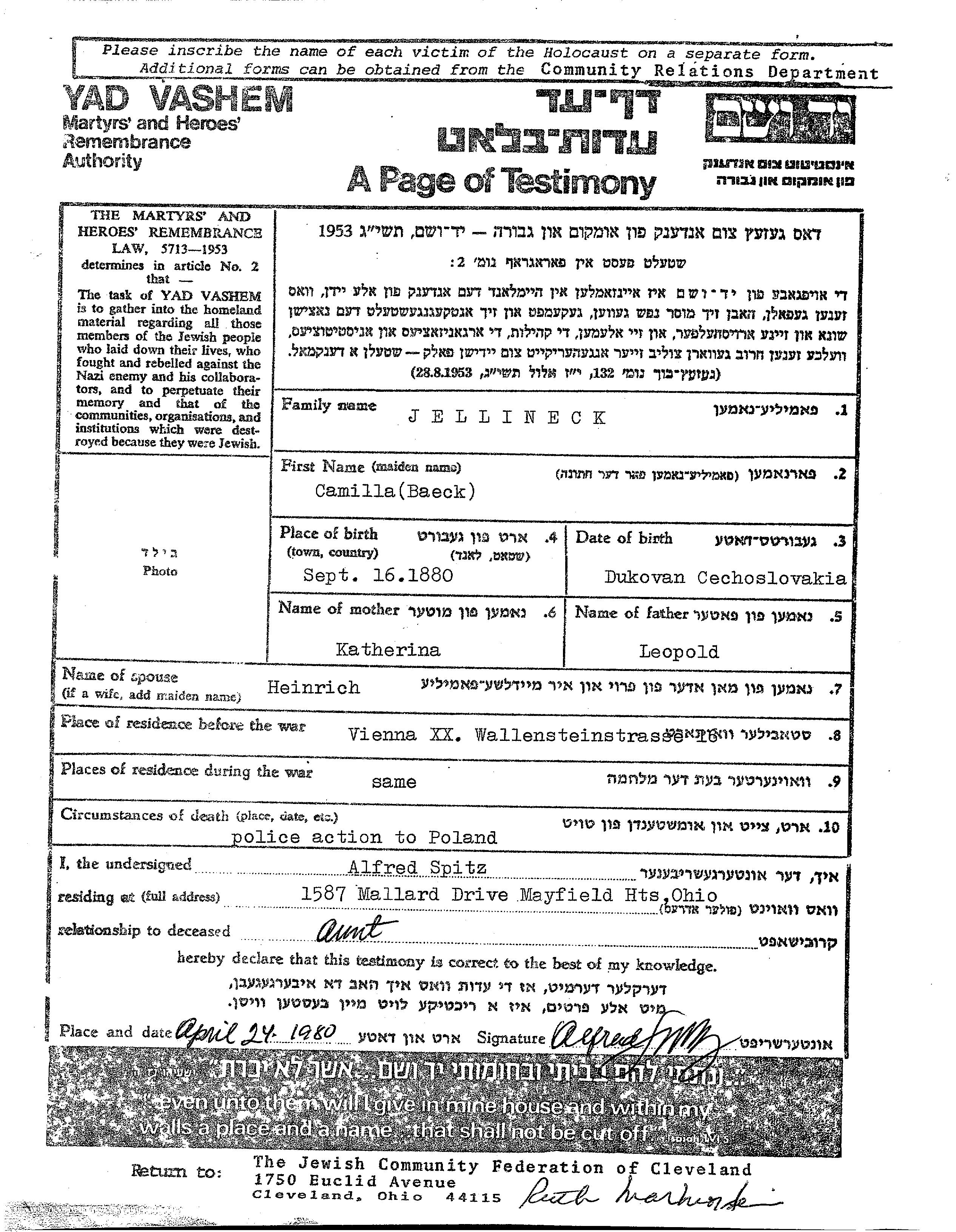Камилла Еллинек, девичья фамилия Бек, место рождения: Дуковани, Чехословакия. Отец: Леопольд, mать:Катерина. Женат / замужем. Место жительства до войны: Вена, Австрия. Место во время войны: Вена, Австрия.