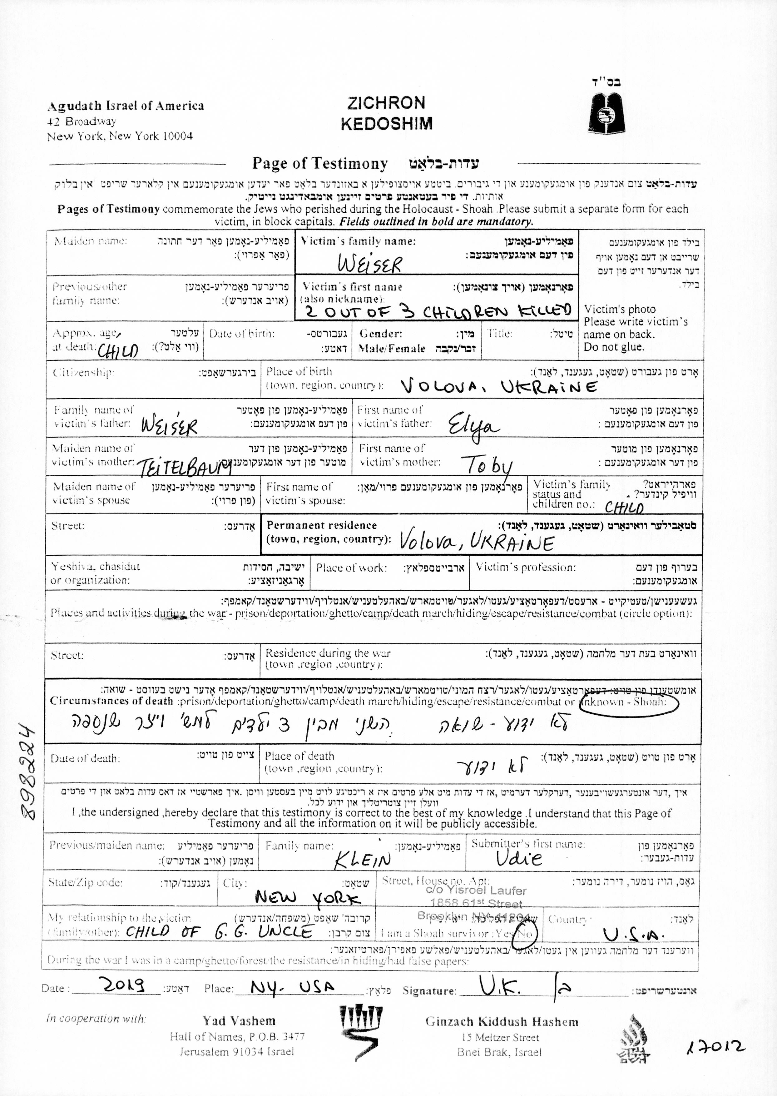 Имя неизвестно Вайзер родился/родилась, место рождения: Волова, Чехословакия. Отец: Эля, mать:Тоби, девичья фамилия Тейтельбаум. Ребенок. Место жительства до войны: Волова, Чехословакия.