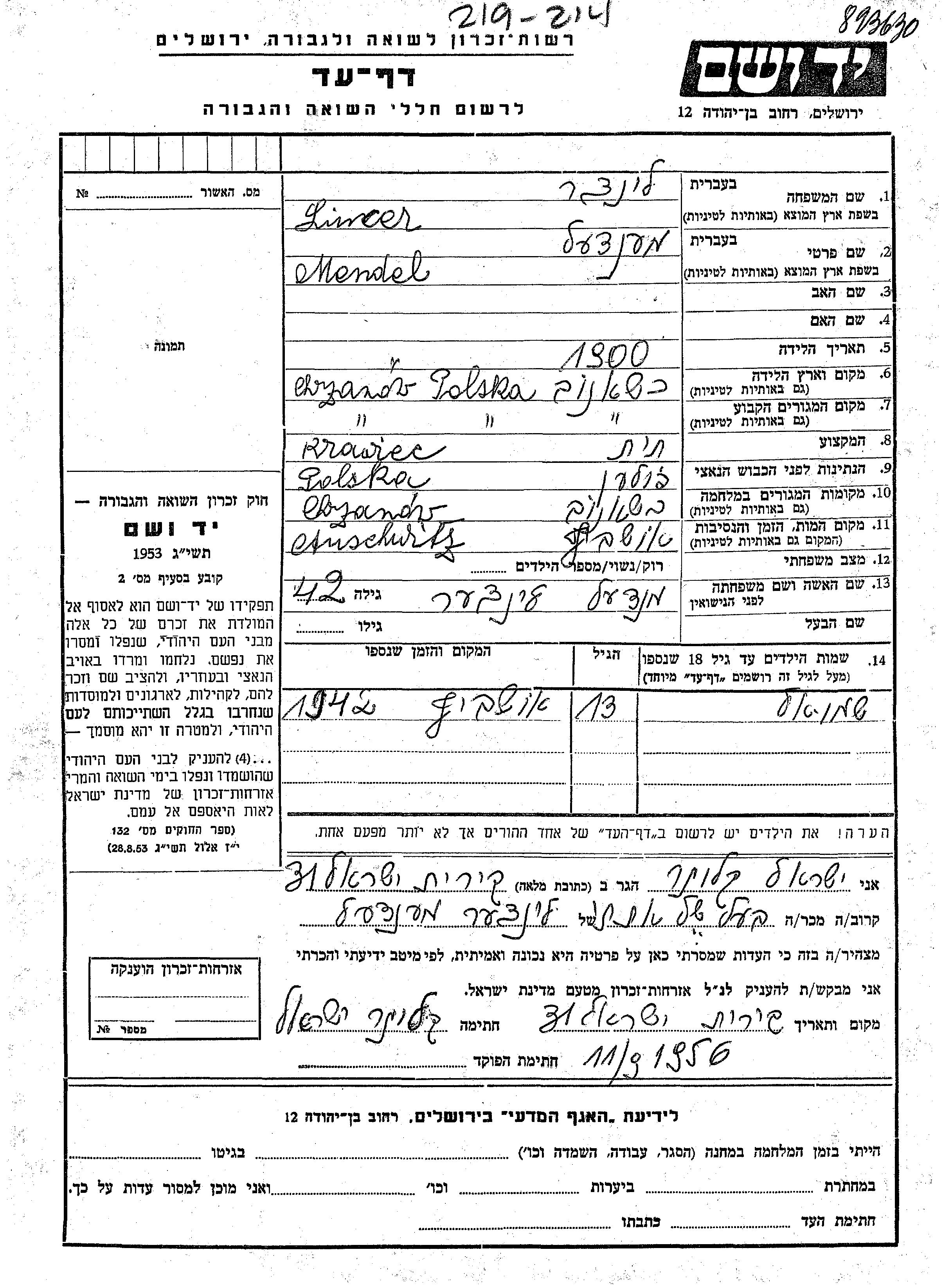 Мендель Линцер, место рождения: Хшанув, Польша. Портной / портниха. Женат / замужем. Место жительства до войны: Хшанув, Польша. Место во время войны: Хшанув, Польша.