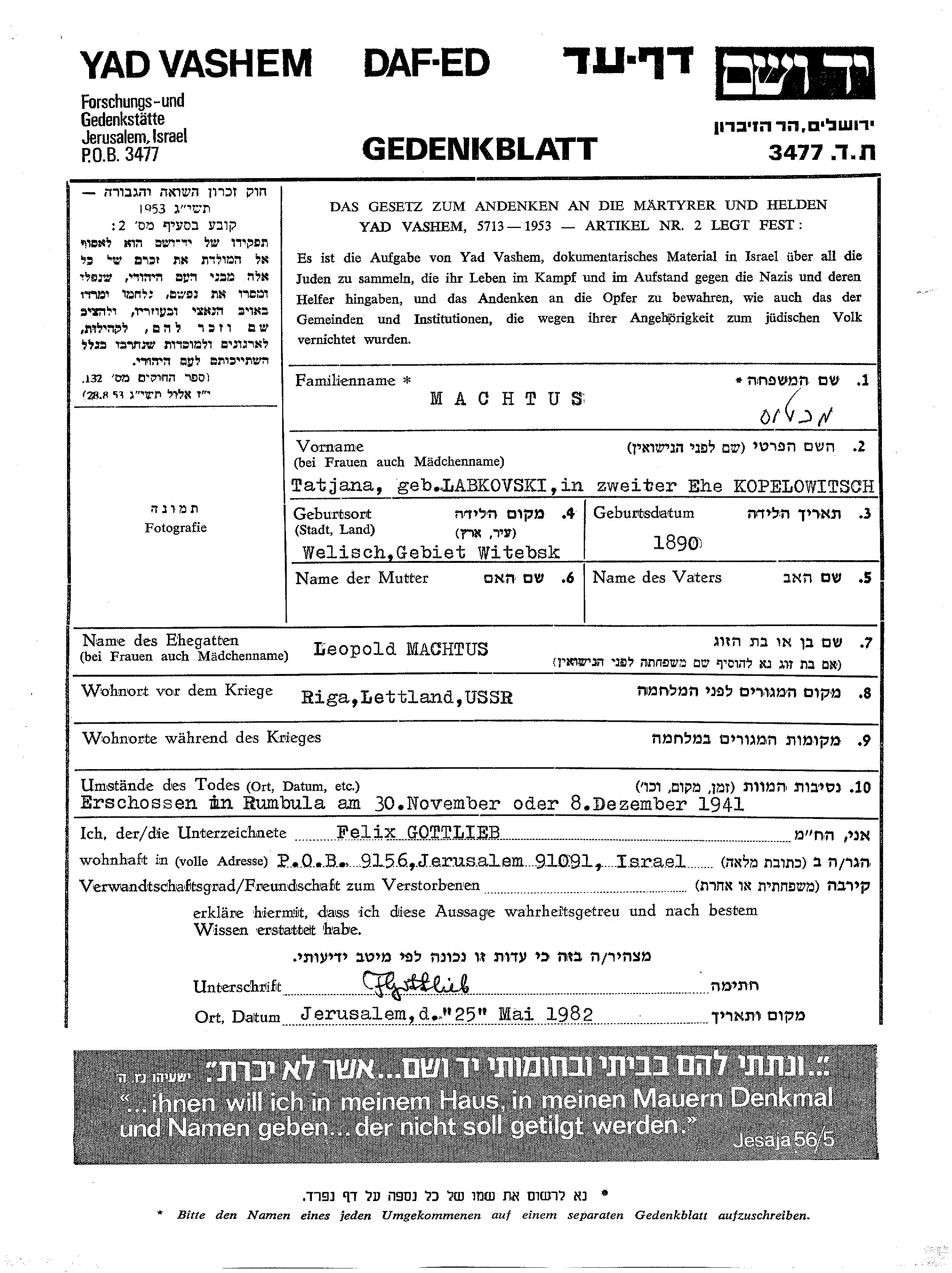 Татьяна Махтус Копелович, девичья фамилия Лабковский, место рождения: Велиж, Россия (СССР). Женат / замужем. Место жительства до войны: Рига, Латвия.