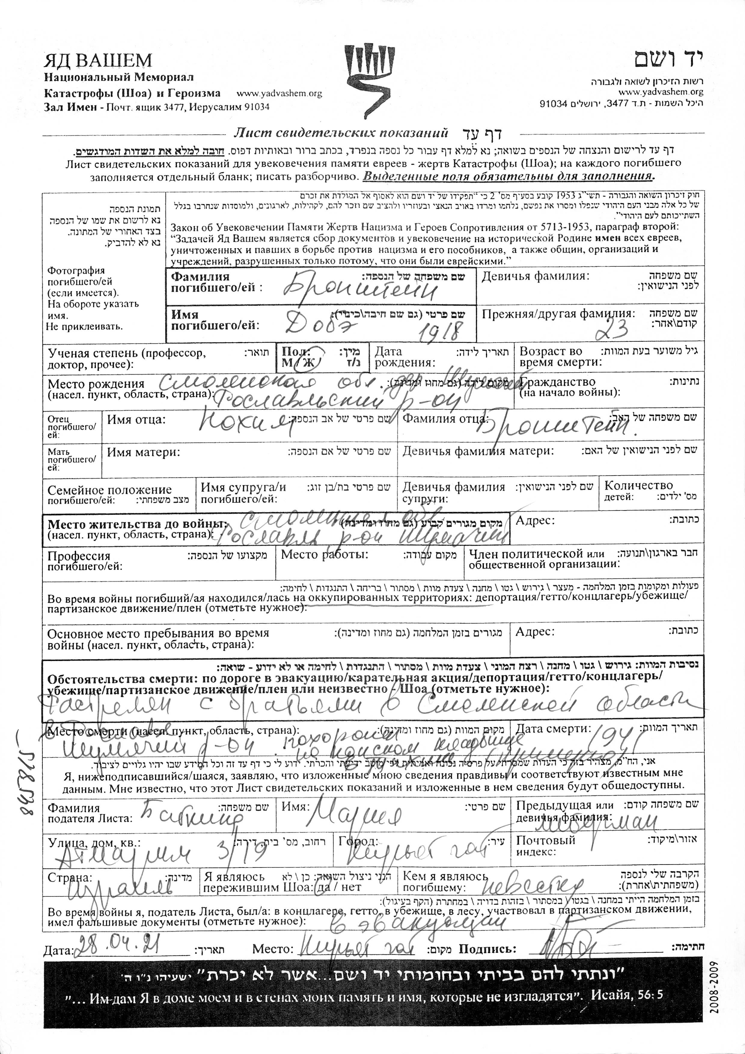 Бронштейн Добе 1918 Рославль, Россия (СССР) Лист свидетельских показаний