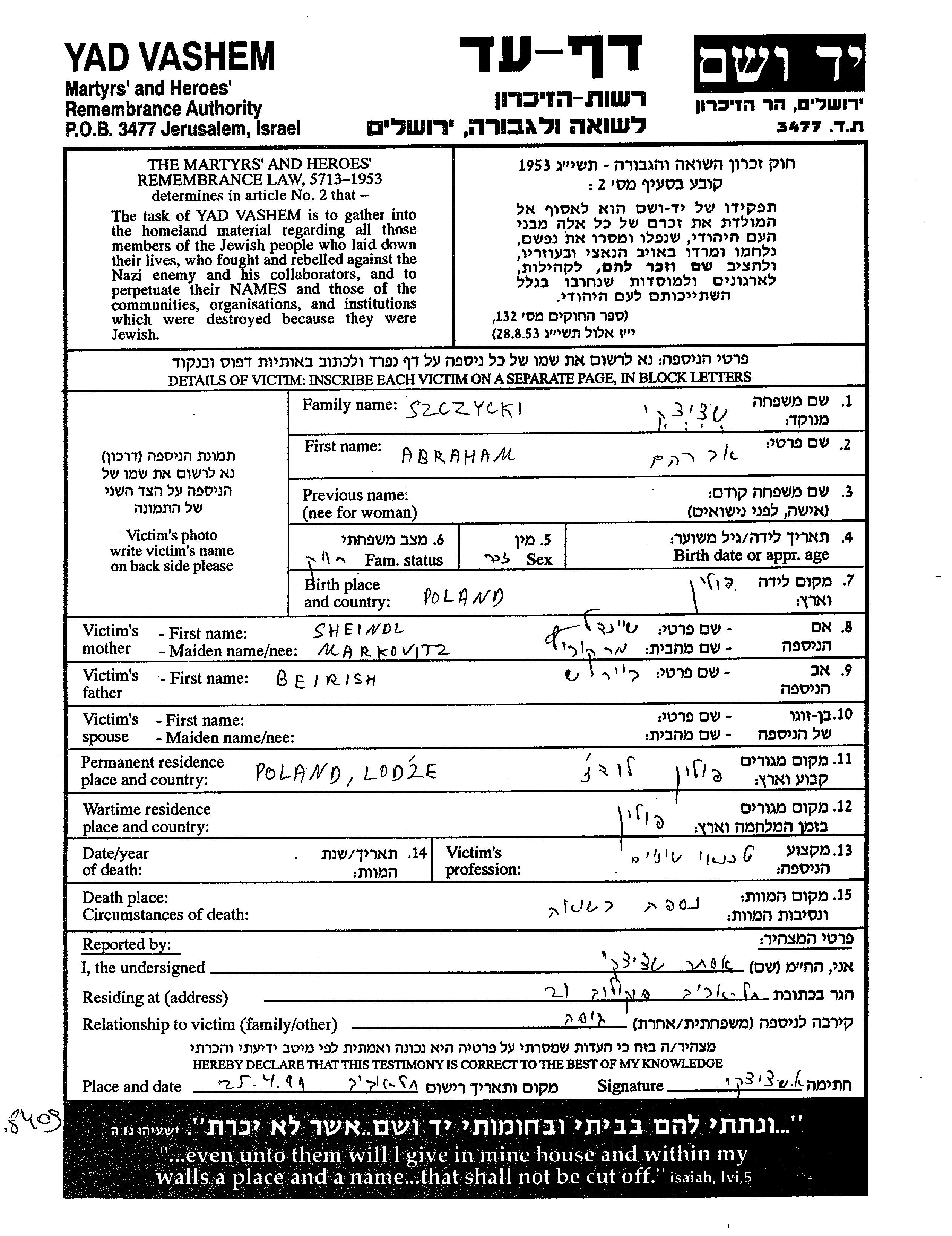 Щицки Абраам Лодзь, Польша Лист свидетельских показаний