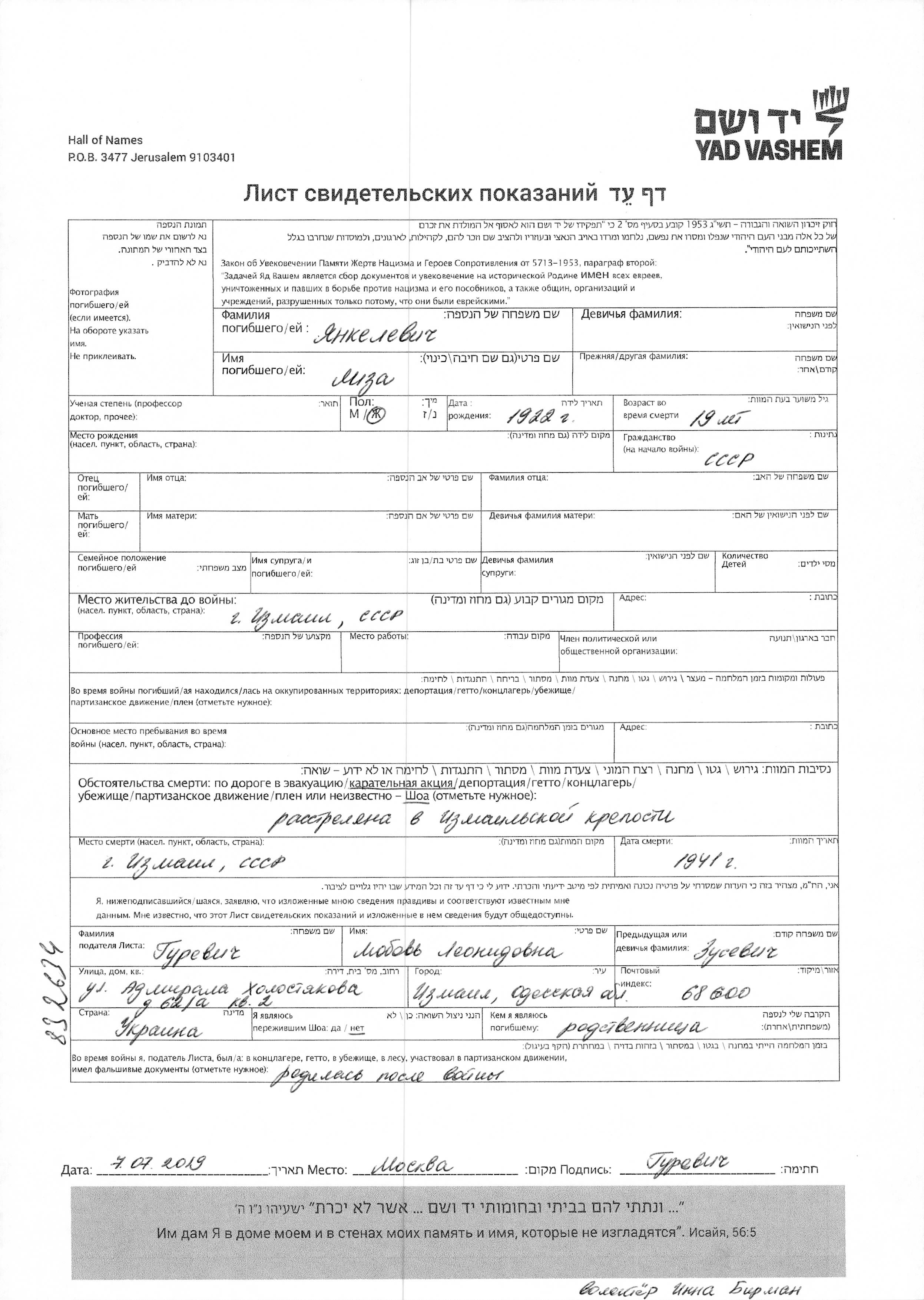Янкилевич Лиза 1922 Измаил, Румыния Лист свидетельских показаний