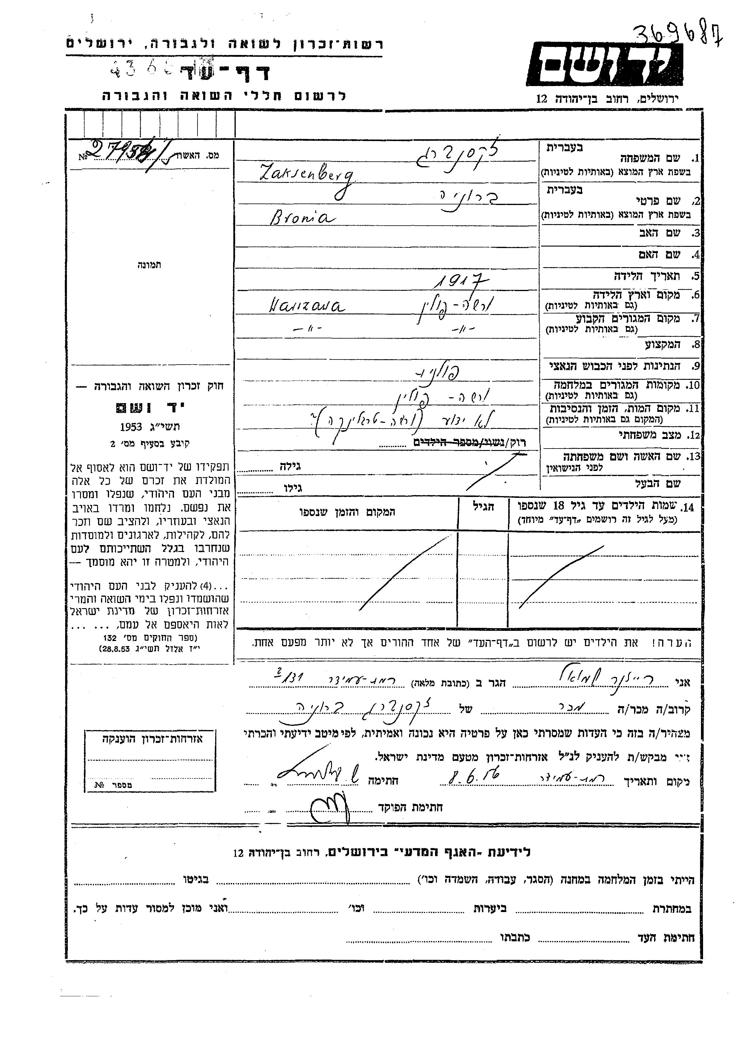 Броня Заксенберг, место рождения: Варшава, Польша. Холост / не замужем. Место жительства до войны: Варшава, Польша. Место во время войны: Варшава, Польша.