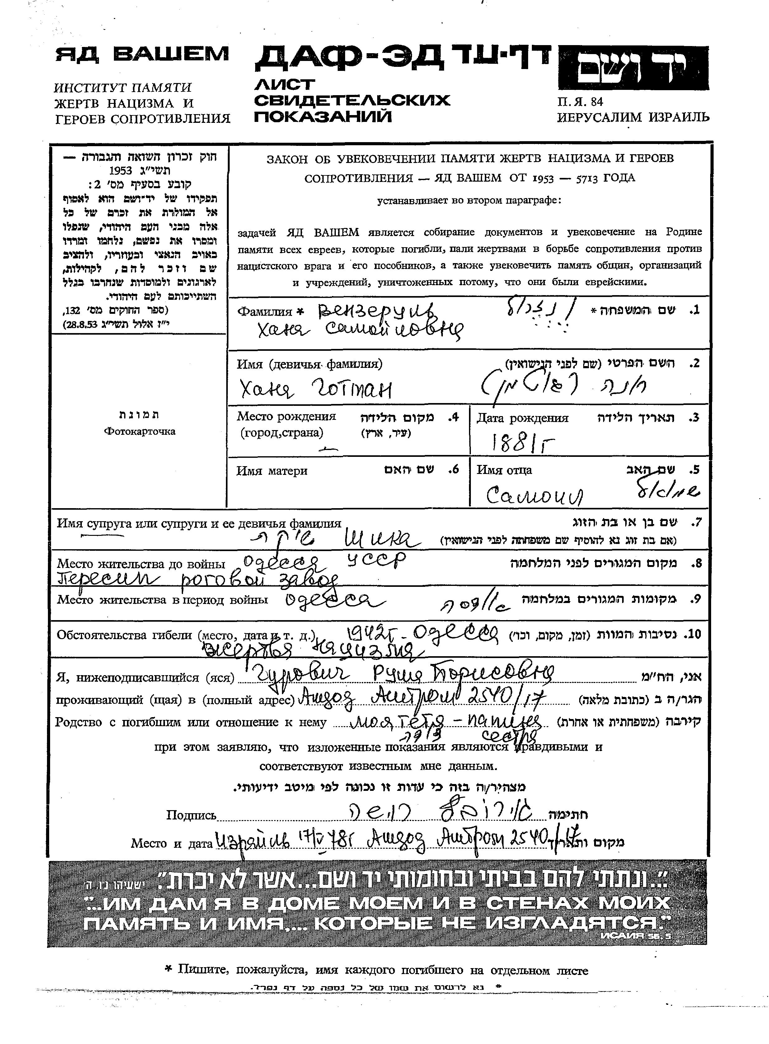 Яд Вашем - Листы свидетельских показаний Мемориального фонда