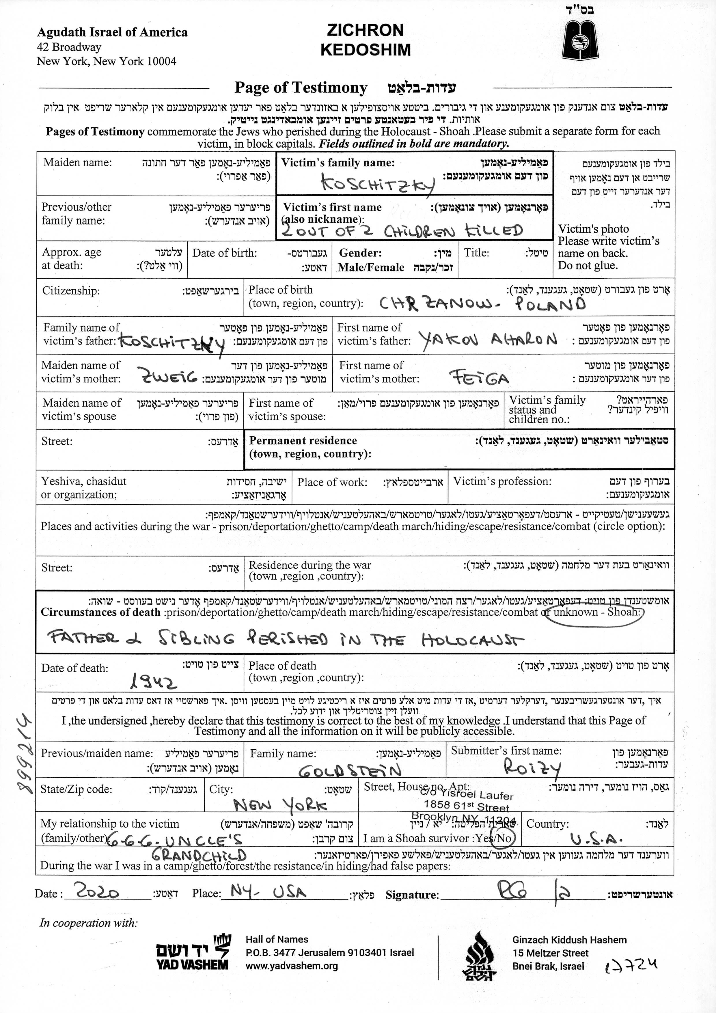 Имя неизвестно Кошицки родился/родилась, место рождения: Хшанув, Польша. Отец: Яков Ахарон, mать:Фейга, девичья фамилия Цвейг.