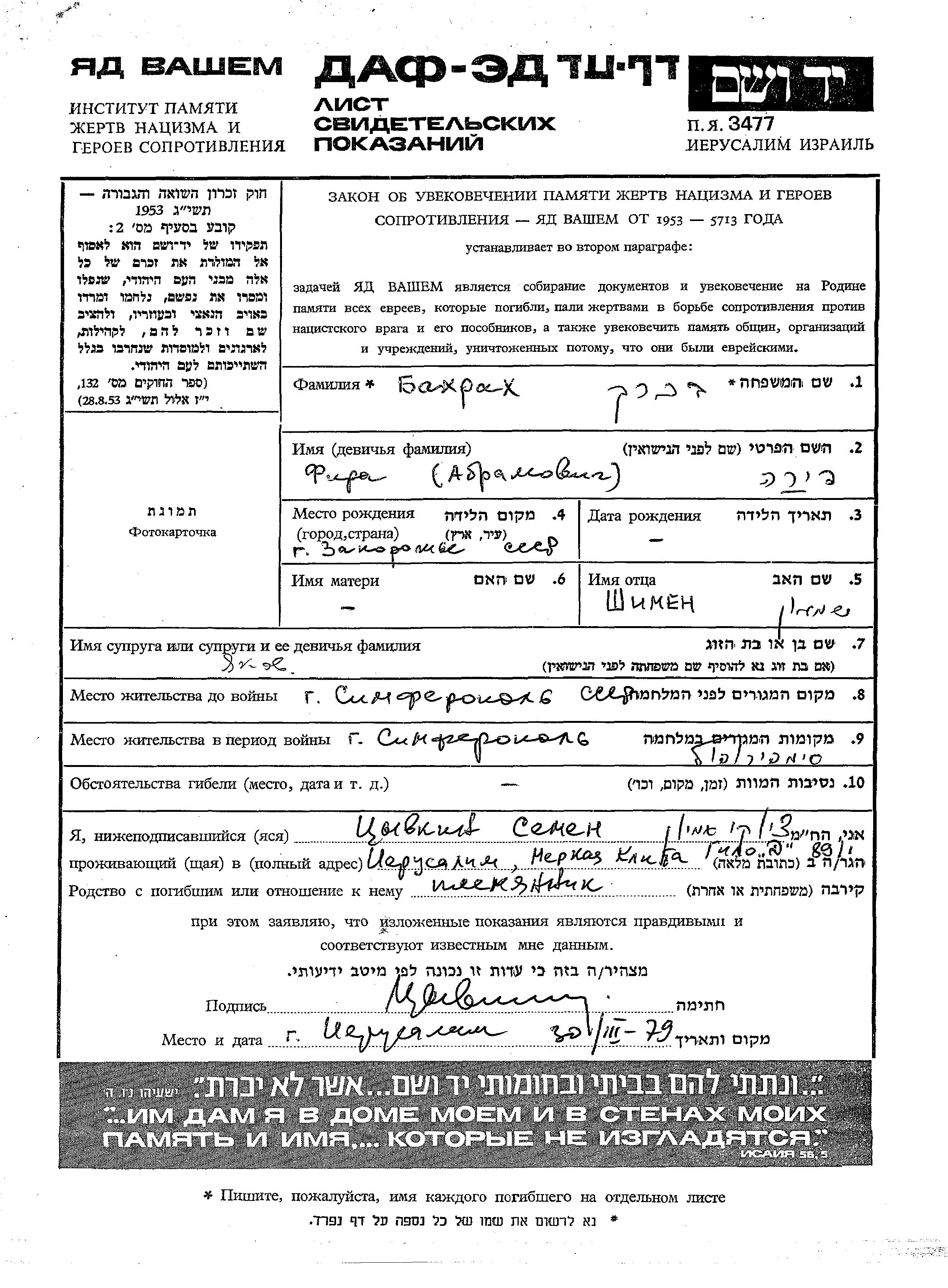 Бахрах Фира Симферополь, Россия (СССР) Лист свидетельских показаний