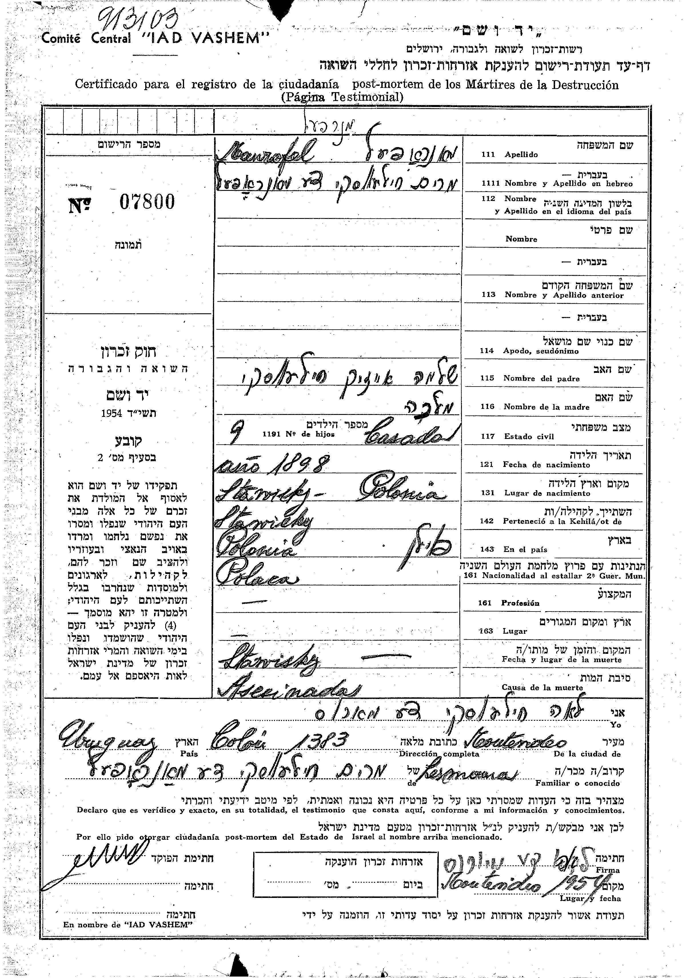 Манрофель Мирьям 1898 Стависки, Польша Лист свидетельских показаний