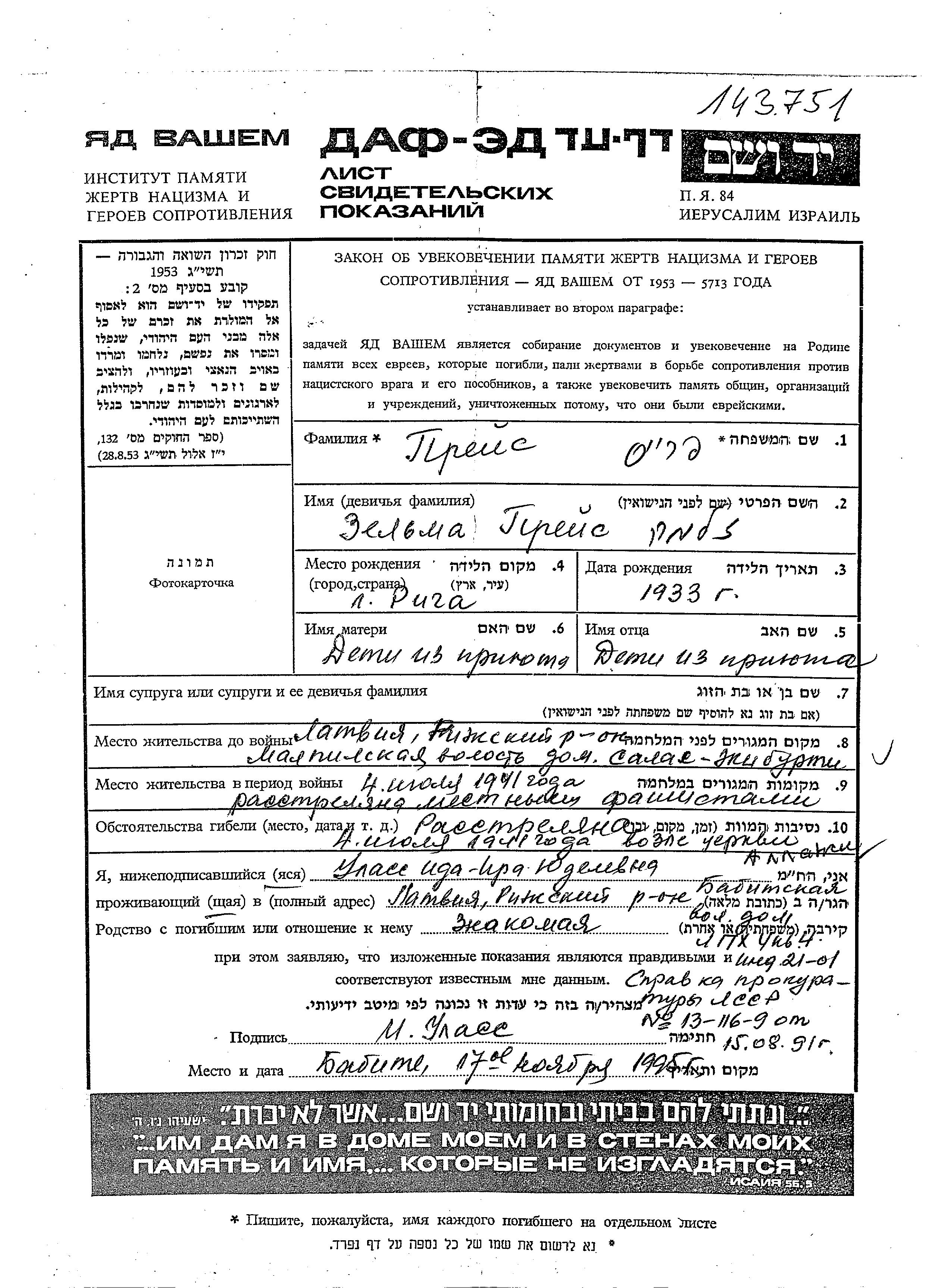 Яд Вашем - Листы свидетельских показаний Мемориального фонда
