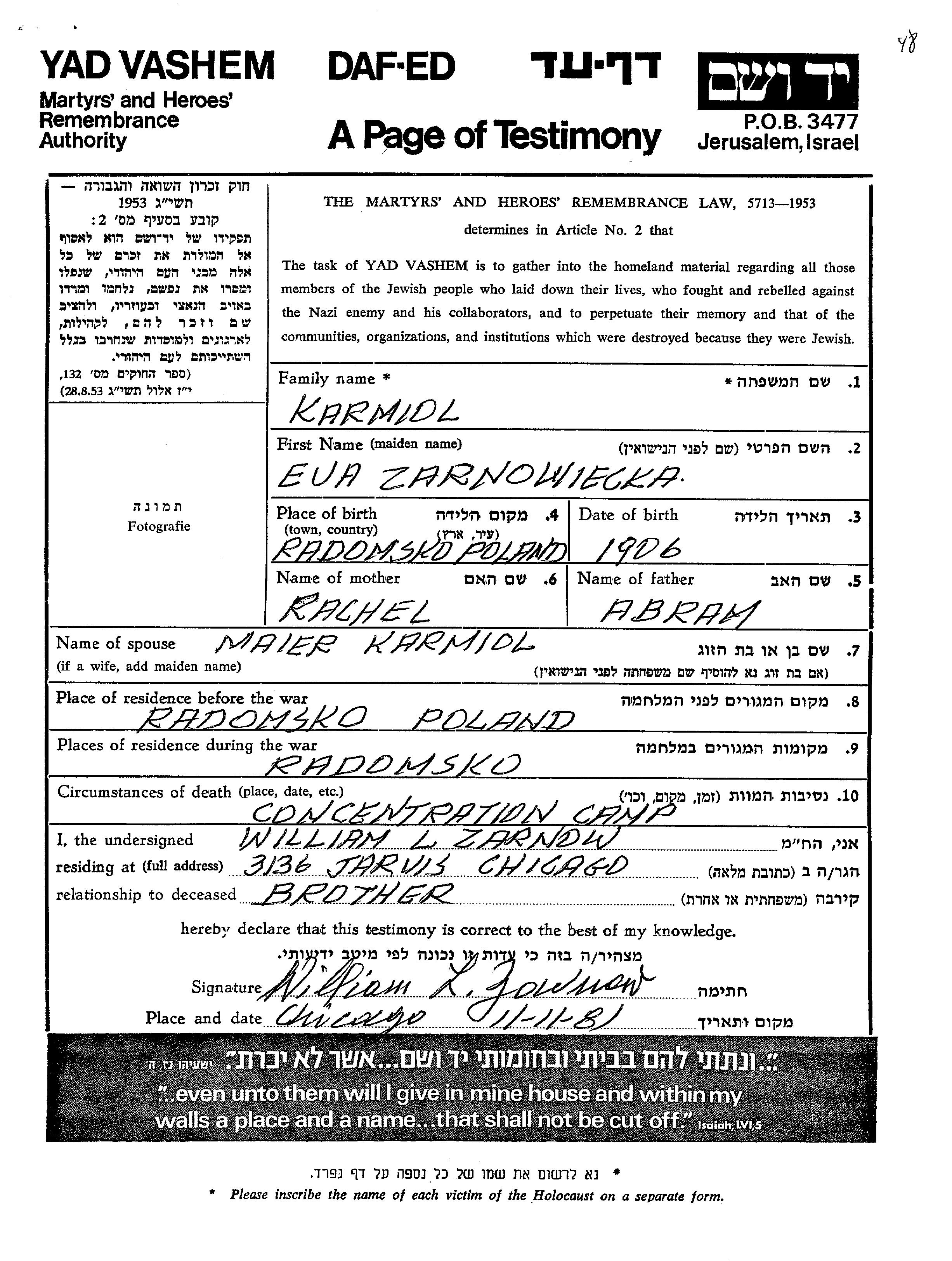 Кармиоль Эва 1906 Радомско, Польша Лист свидетельских показаний