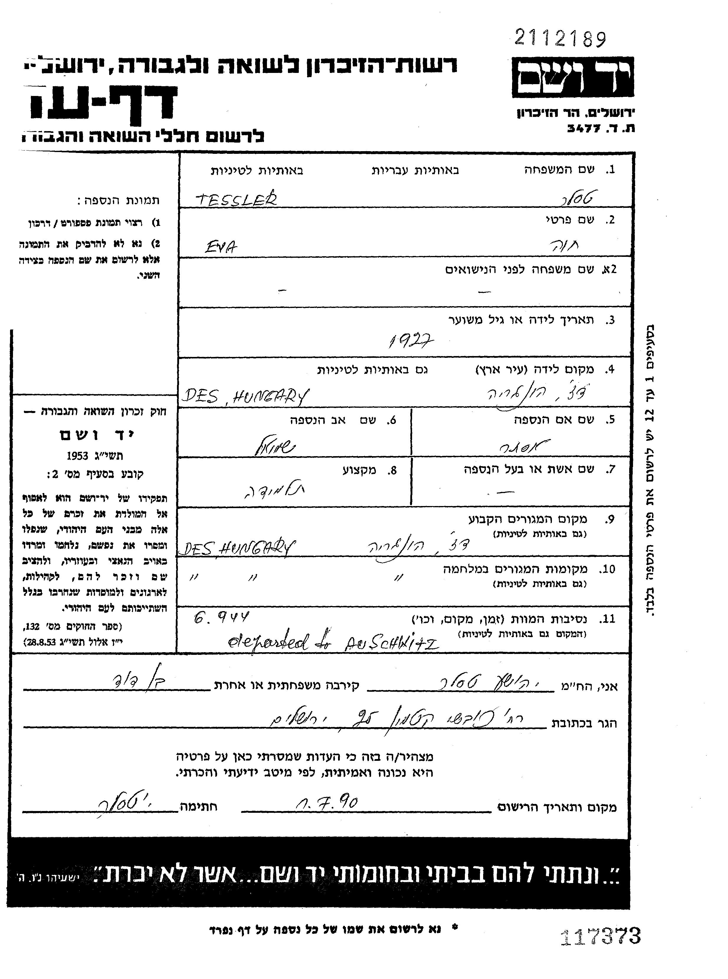 | Тесслер | Эва Хава | 1927 | Деж, Румыния | Лист свидетельских показаний |