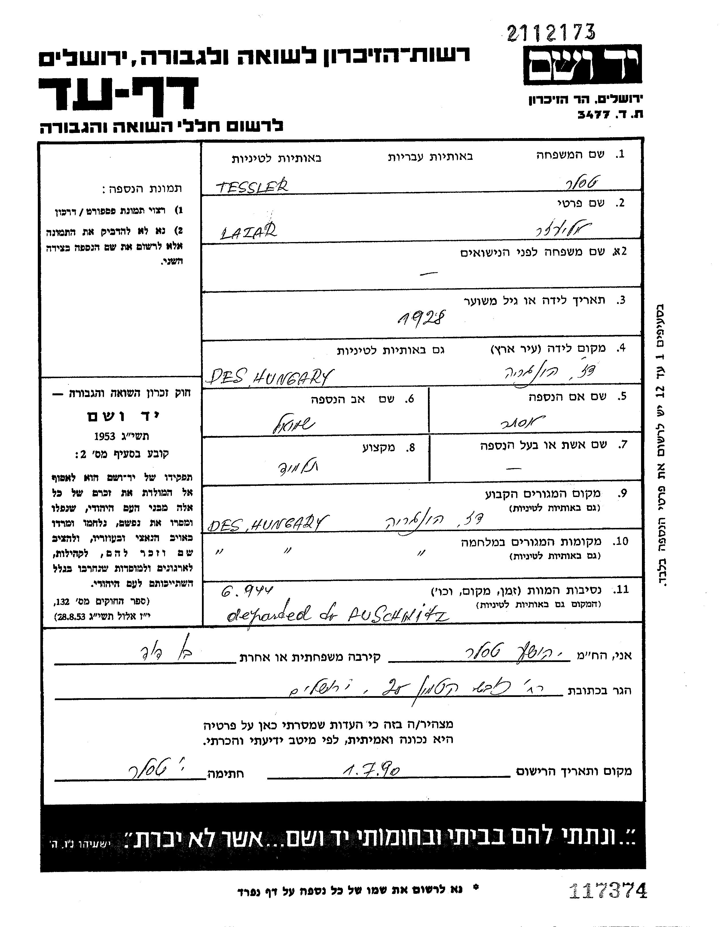 | Тесслер | Лазарь | 1928 | Деж, Румыния | Лист свидетельских показаний |