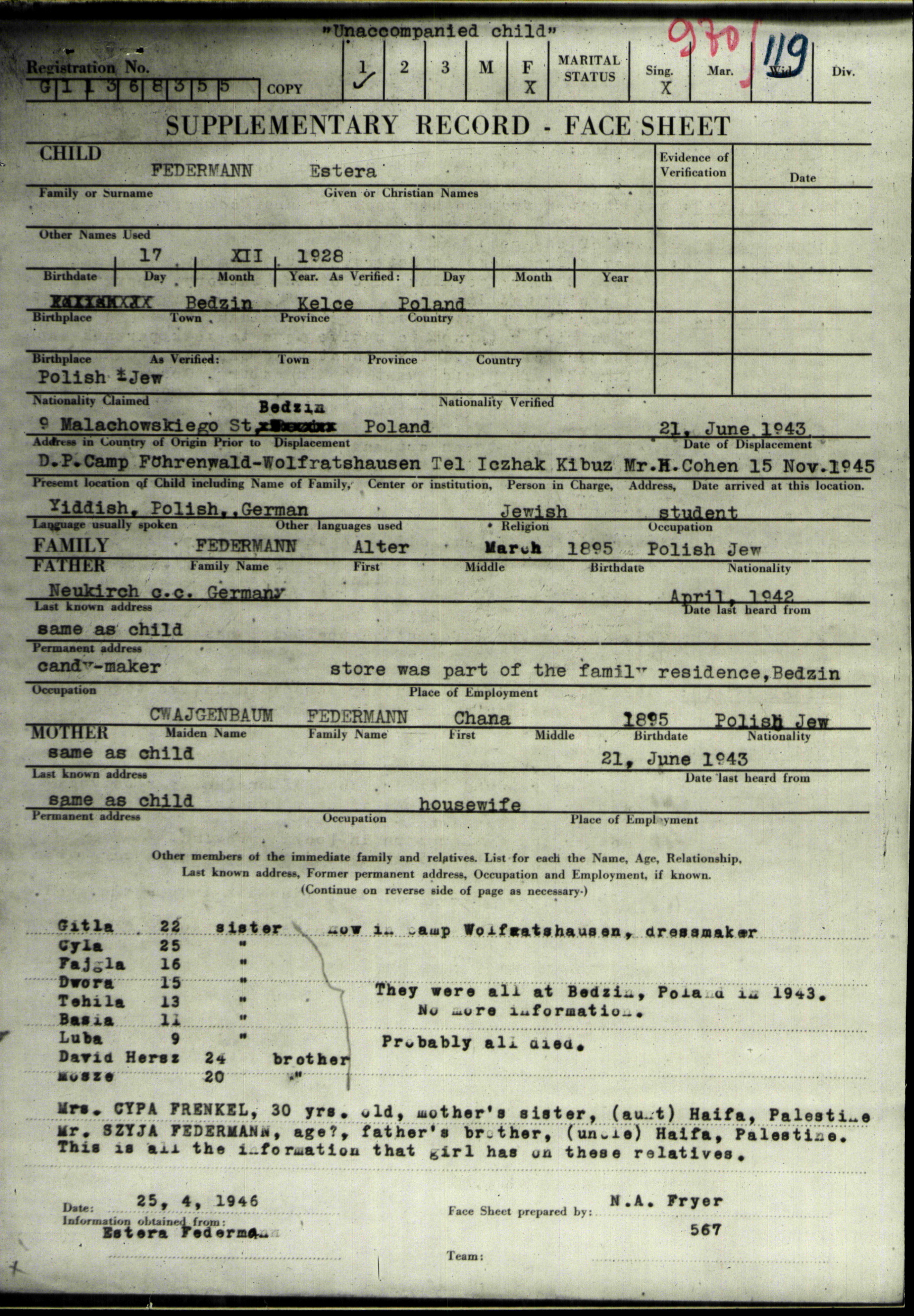 Цила Федерманн, девичья фамилия Федерман, место рождения: Бендзин, Польша. Место жительства до войны: Бендзин, Польша.