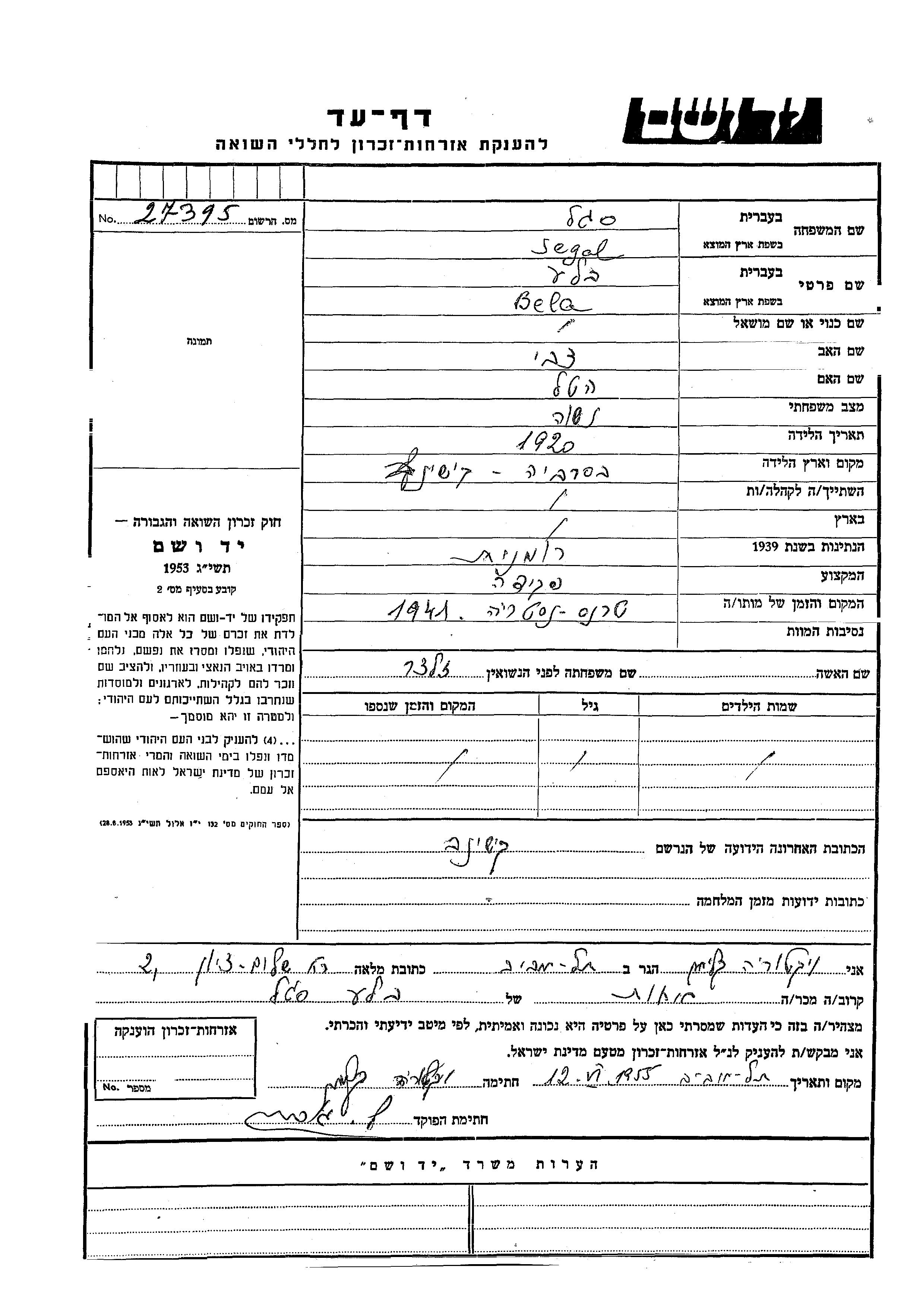 Бела Зельтер Сегаль Зельцер, девичья фамилия Зельцер, место рождения: Кишинёв, Румыния. Клерк. Место жительства до войны: Кишинёв, Румыния.
