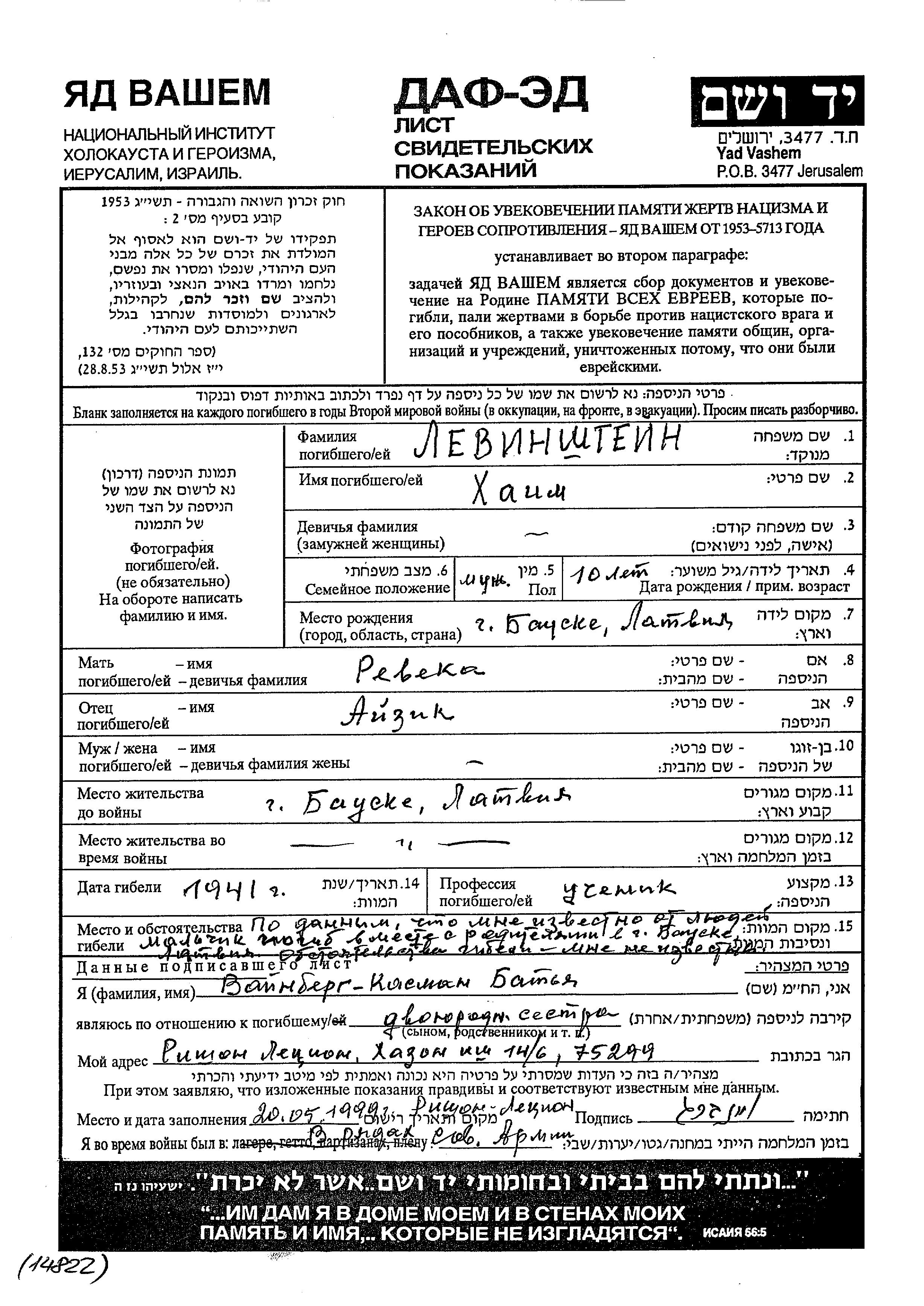 Левинштейн Хаим Бауск, Латвия Лист свидетельских показаний