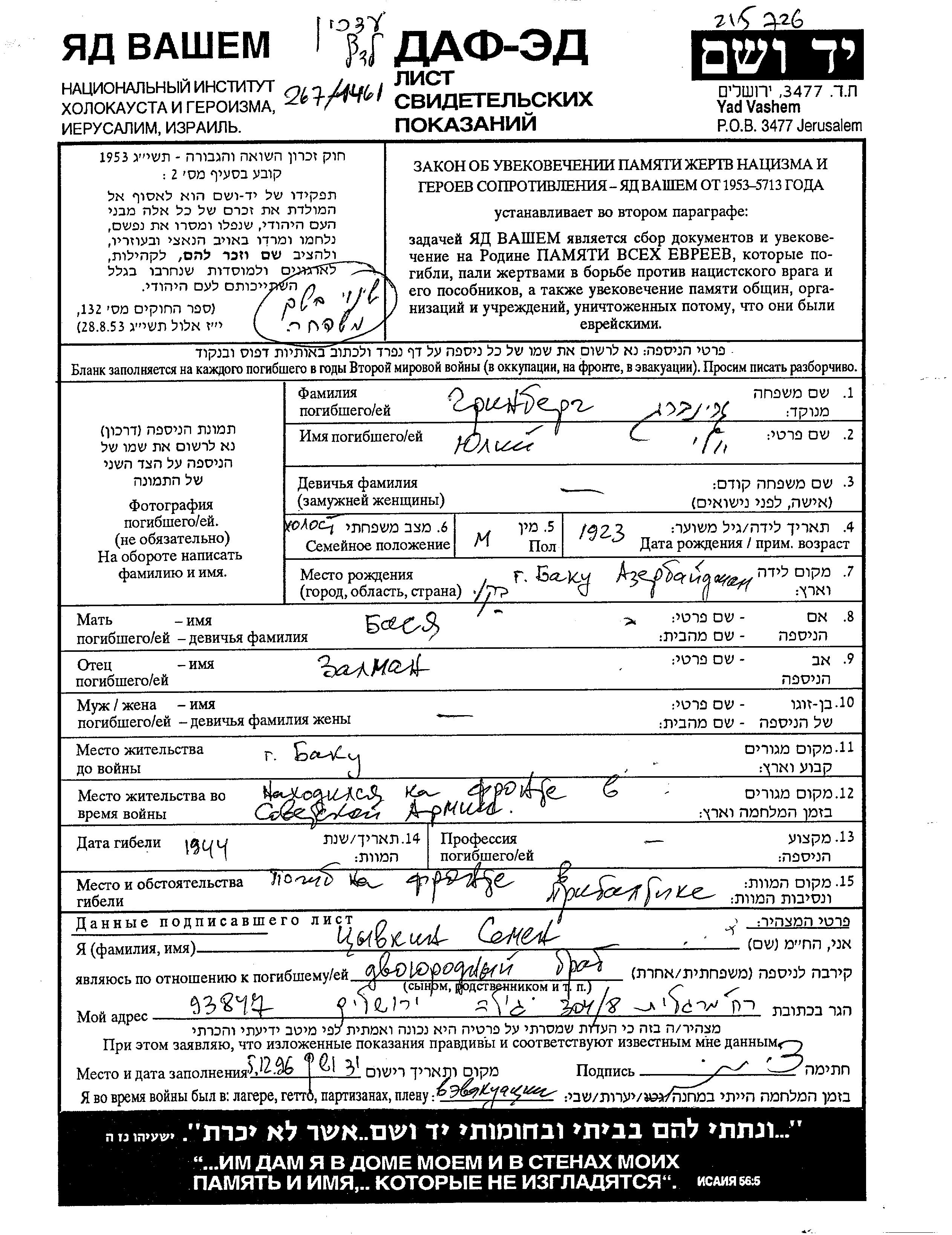 Гринберг Юлий Баку, Азербайджан (СССР) Лист свидетельских показаний