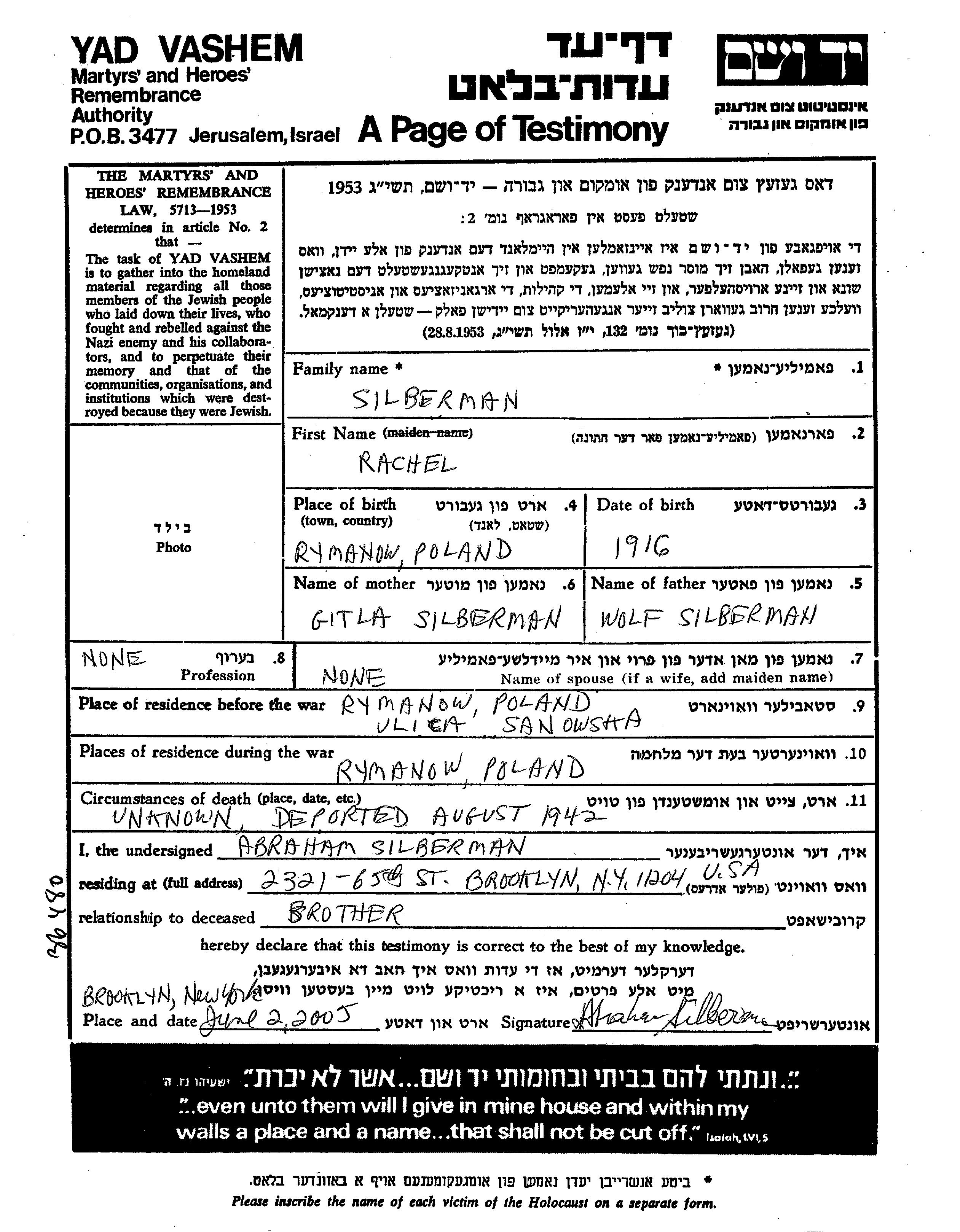 Зильберман Рахель 1916 Рыманув, Польша Лист свидетельских показаний