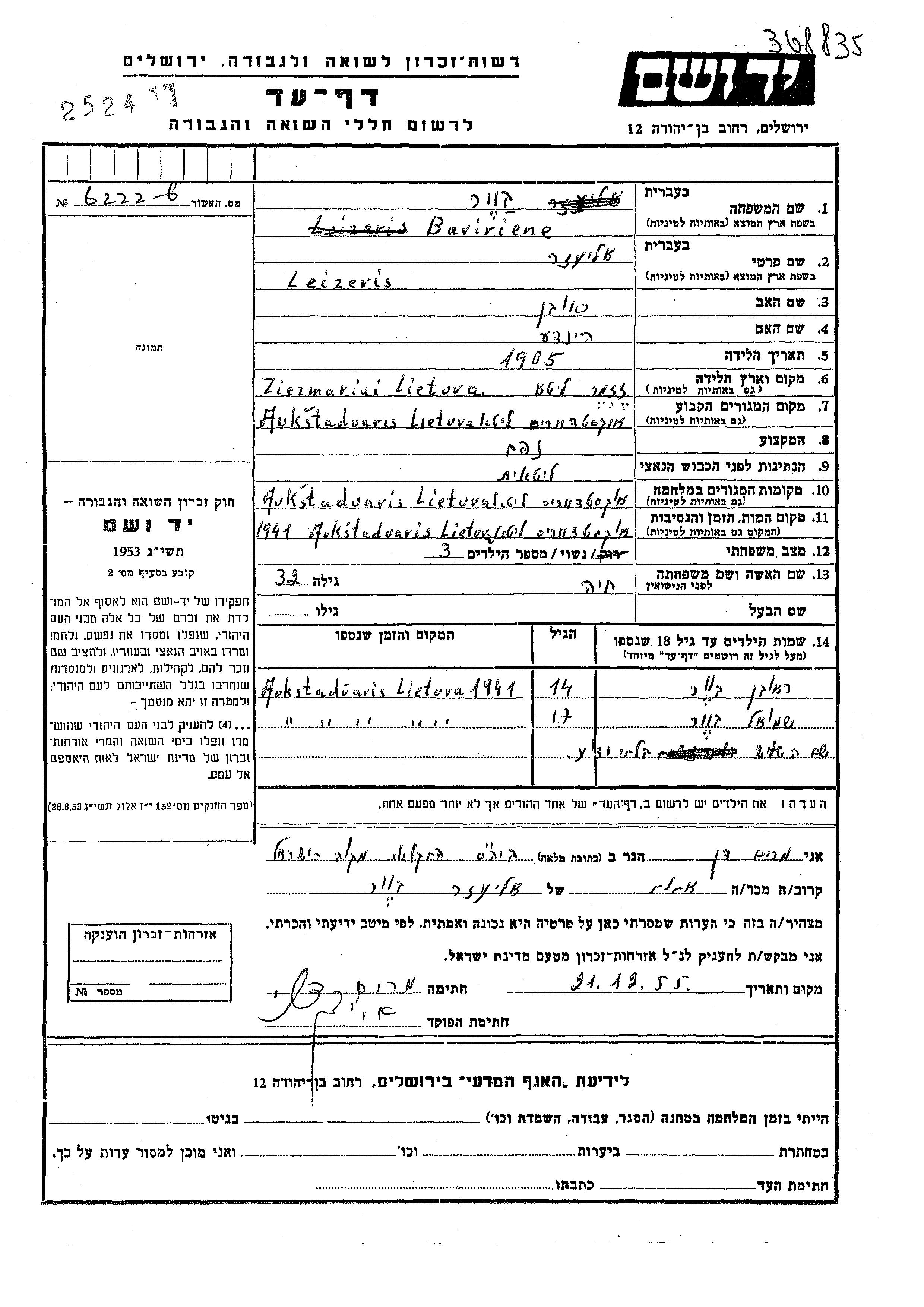 Бавириене | Шмуэль | Аукштадварис, Литва | Лист свидетельских показаний | |