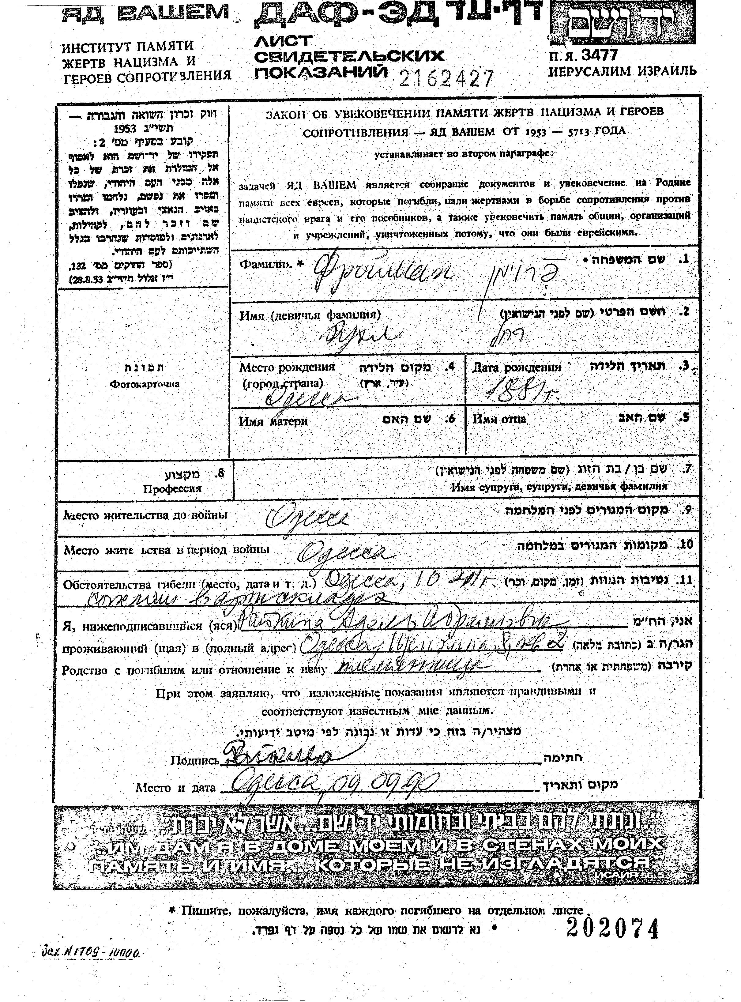 | Фройман | Рахиль | 1881 | Одесса, Украина (СССР) | Лист свидетельских показаний |