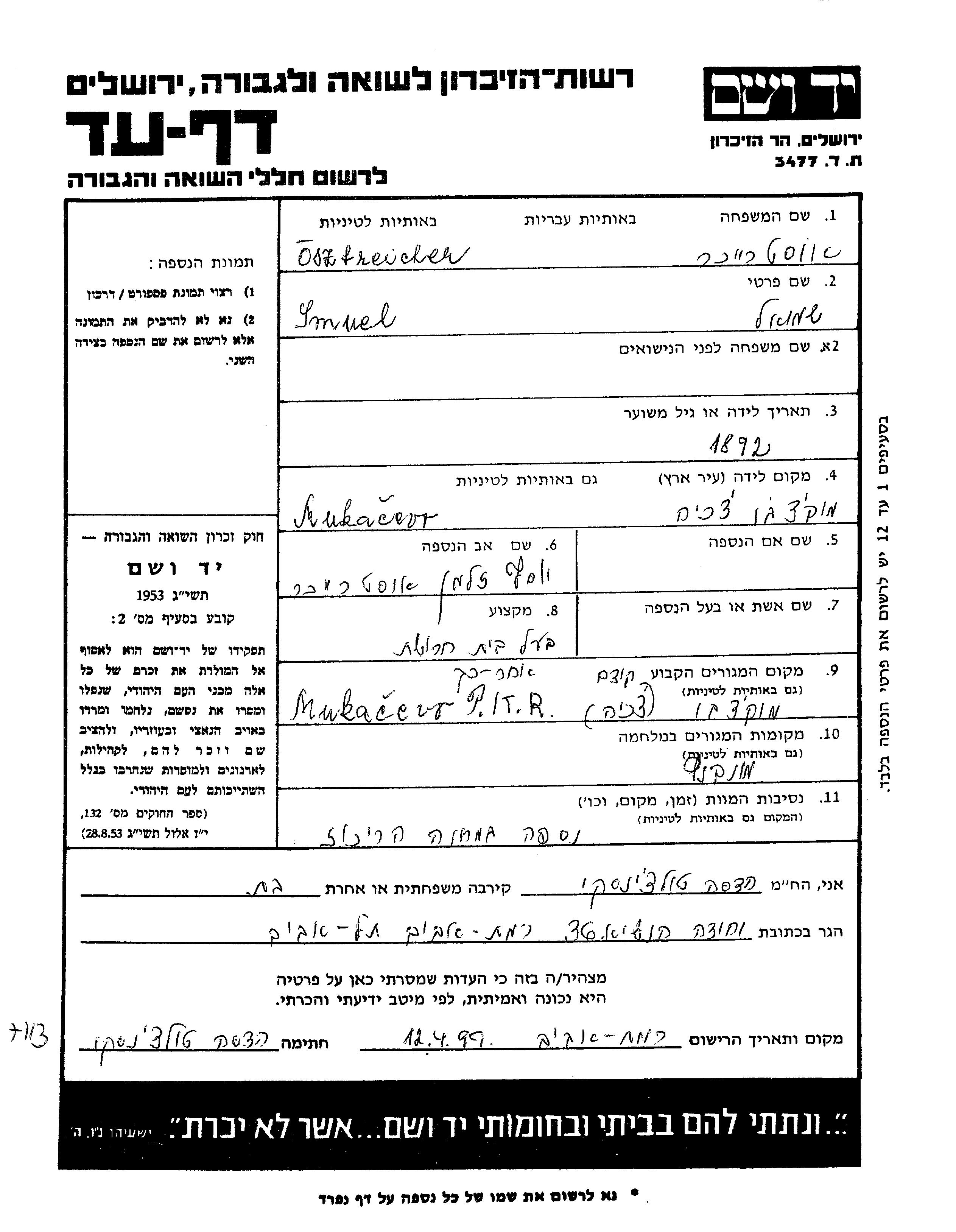 Острейхер Шмуэль 1888 Мункач, Чехословакия Лист свидетельских показаний
