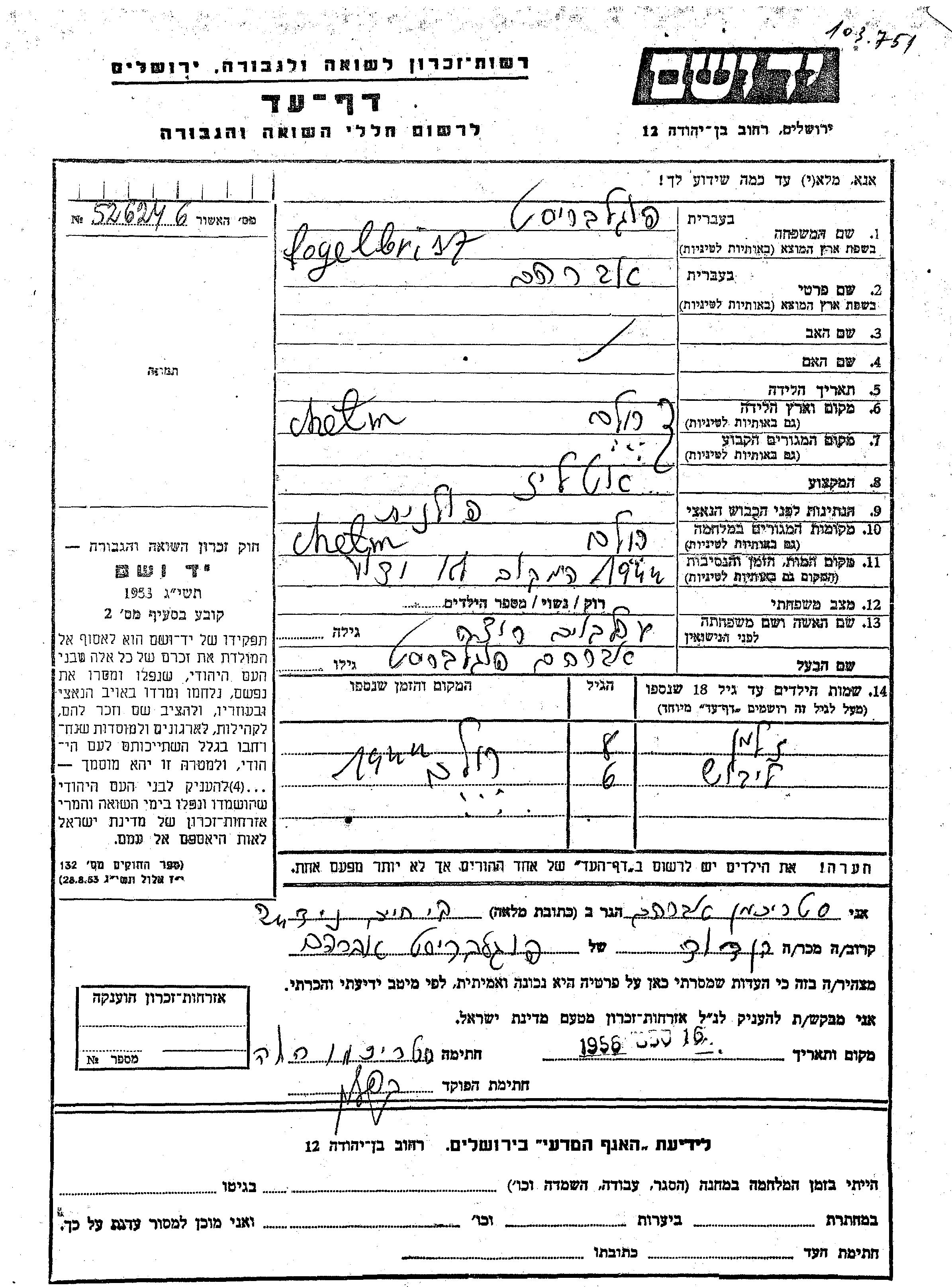 | Фогельбрист | Залман | Хелм, Польша | Лист свидетельских показаний |