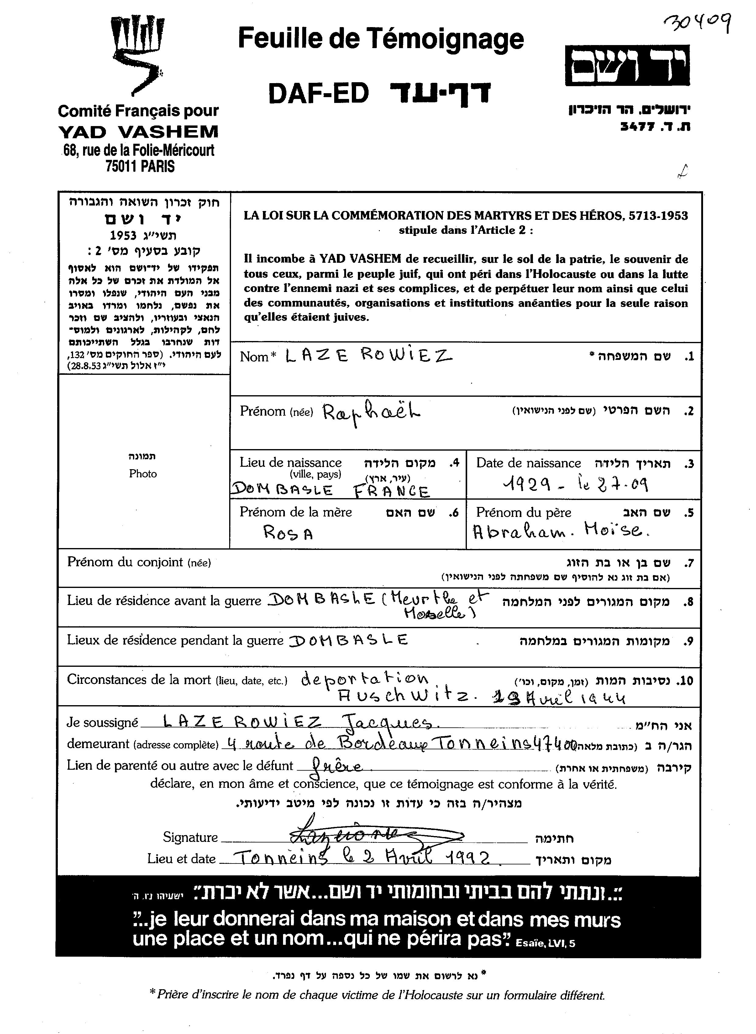 Лазерович Рафаэль 1929 Домбаль, Франция Лист свидетельских показаний