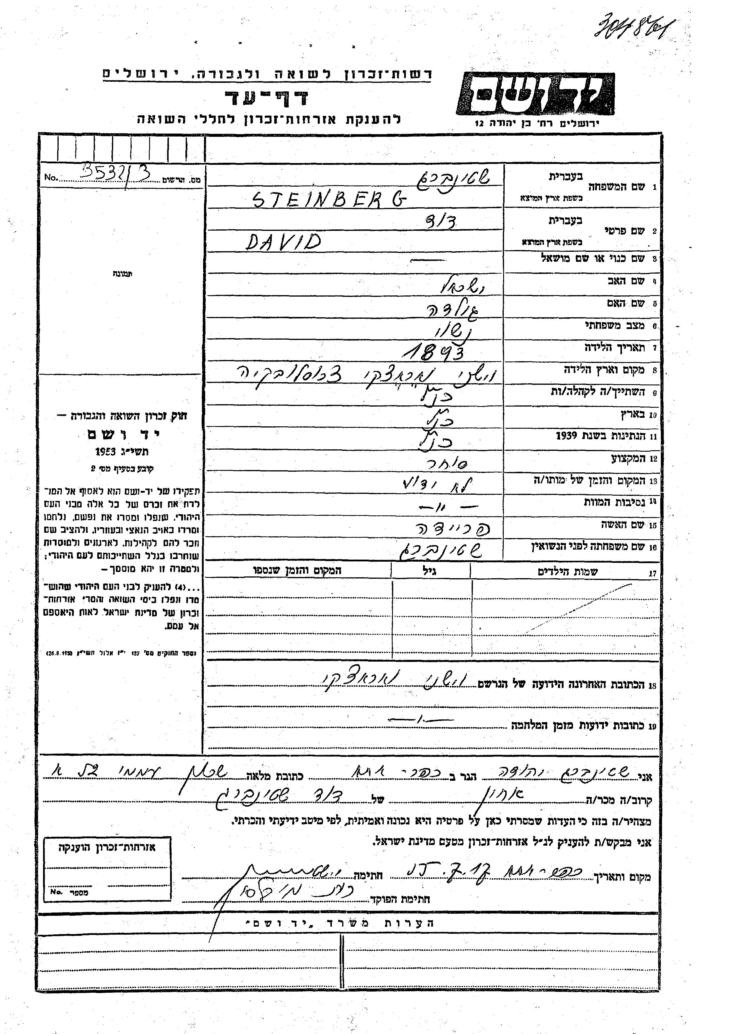 Штайнберг Давид 1893 Вишни Верецки, Чехословакия Лист свидетельских показаний