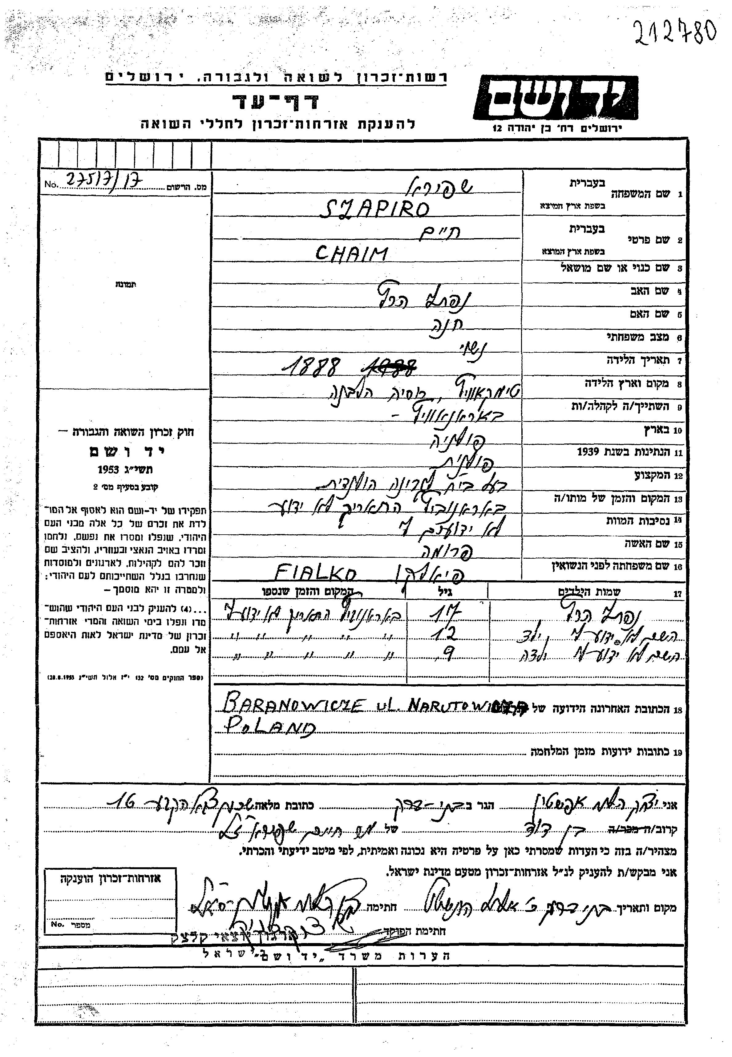 Шапира | Нафтали Херц | Барановичи, Польша | Лист свидетельских показаний |