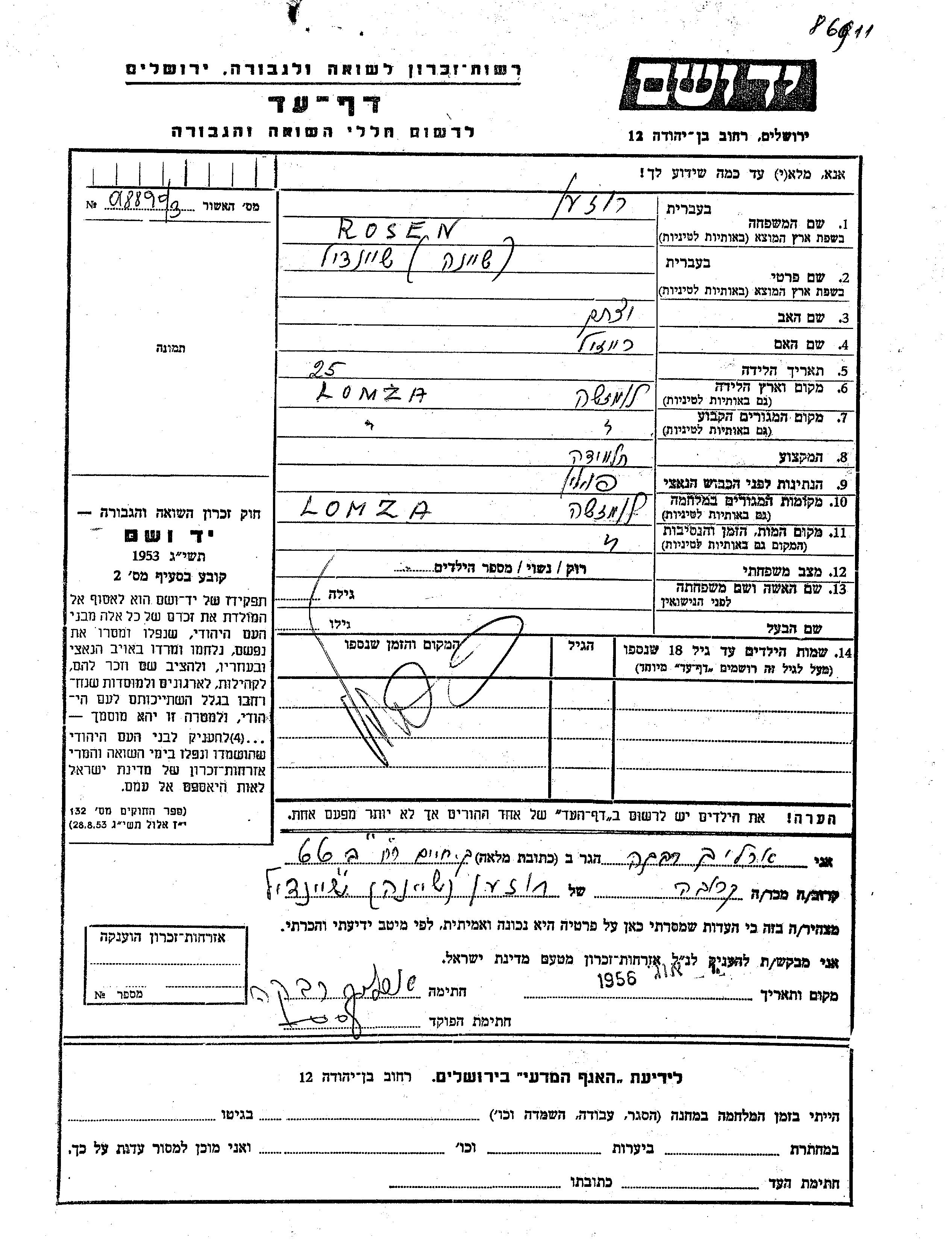 Розен Шейна Рахель 1920 Ломжа, Польша Лист свидетельских показаний