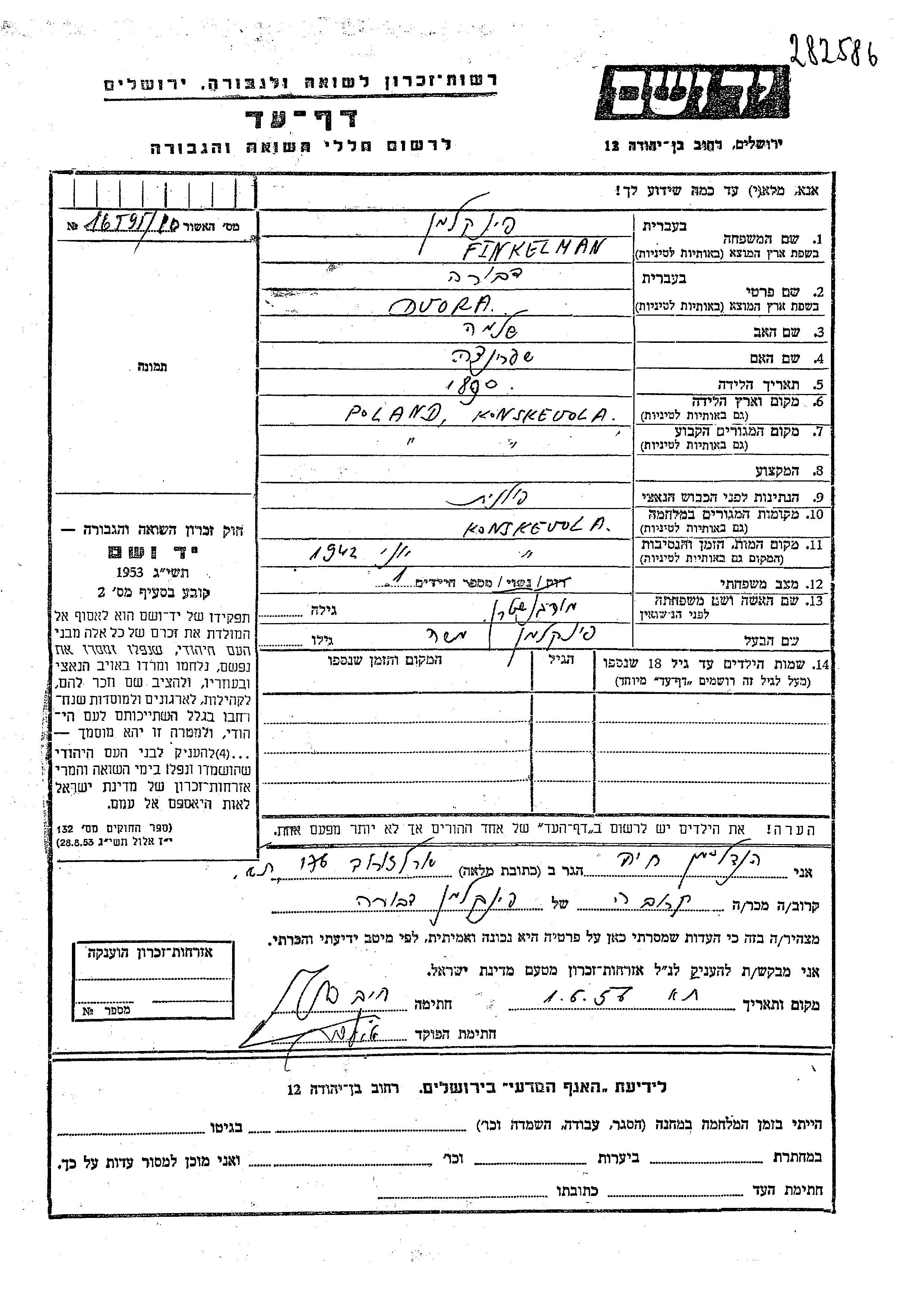 Двора Финкельман, девичья фамилия Моргенштерн, место рождения: Коньсковоля, Польша. Отец: Шломо, mать:Шпринца. Женат / замужем. Место жительства до войны: Коньсковоля, Польша. Место во время войны: Коньсковоля, Польша.