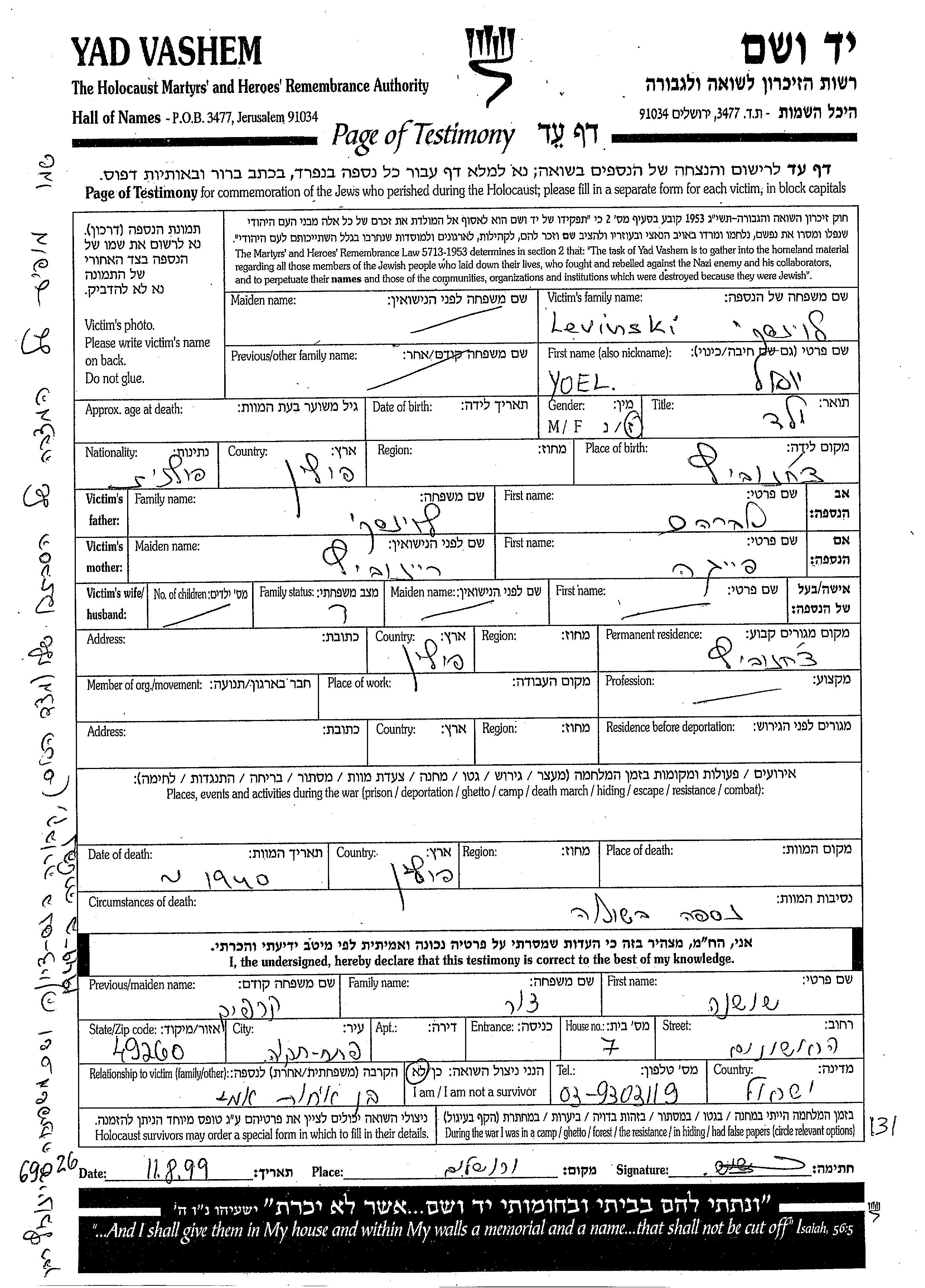| Левински | Йоэль | Цехановец , Польша | Лист свидетельских показаний | |