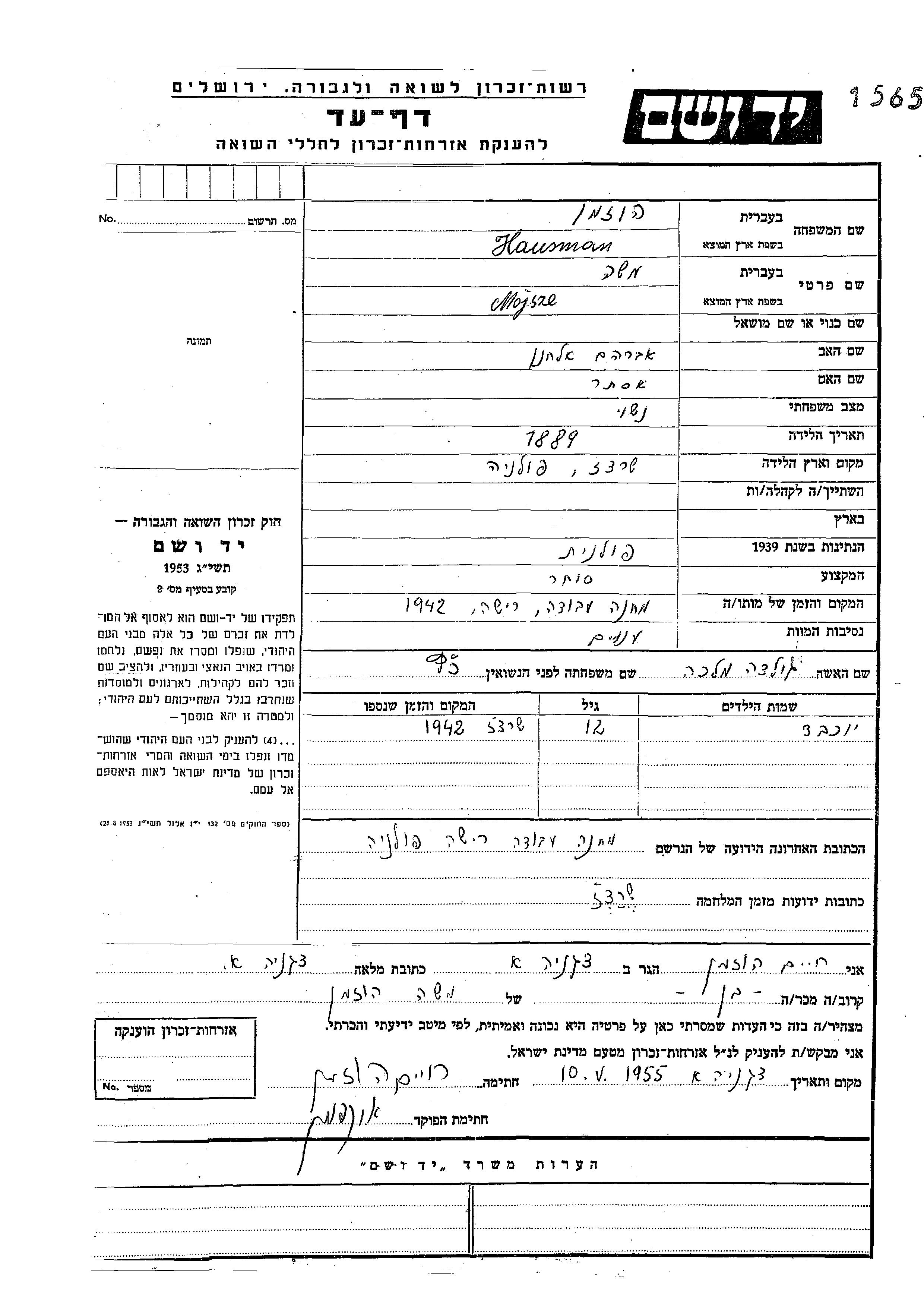 Хаузман Хозман Йохевед Серадз, Польша Лист свидетельских показаний